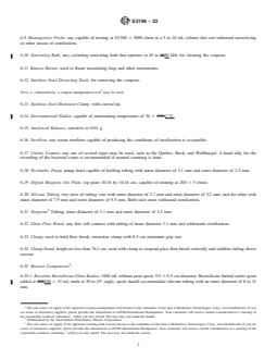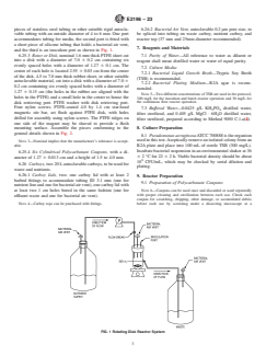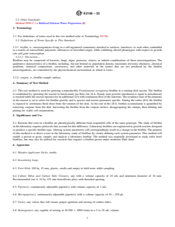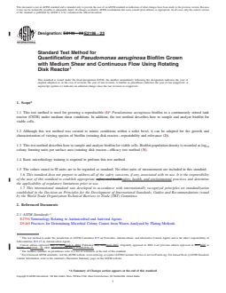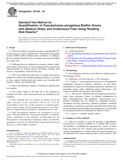 ASTM E2196-23 is a standard published by ASTM International. Its full title is "Standard Test Method for Quantification of <emph type="bdit">Pseudomonas aeruginosa</emph > Biofilm Grown with Medium Shear and Continuous Flow Using Rotating Disk Reactor". This standard covers: SIGNIFICANCE AND USE 5.1 Bacteria that exist in a biofilm are phenotypically different from suspended cells of the same genotype. The study of biofilm in the laboratory requires protocols that account for this difference. Laboratory biofilms are engineered in growth reactors designed to produce a specific biofilm type. Altering system parameters will correspondingly result in a change in the biofilm. The purpose of this method is to direct a user in the laboratory study of biofilms by clearly defining each system parameter. This method will enable a person to grow, sample, and analyze a laboratory biofilm. The method was originally developed to study toilet bowl biofilms, but may also be utilized for research that requires a biofilm grown under moderate fluid shear. SCOPE 1.1 This test method is used for growing a reproducible (1)2 Pseudomonas aeruginosa biofilm in a continuously stirred tank reactor (CSTR) under medium shear conditions. In addition, the test method describes how to sample and analyze biofilm for viable cells. 1.2 Although this test method was created to mimic conditions within a toilet bowl, it can be adapted for the growth and characterization of varying species of biofilm (rotating disk reactor—repeatability and relevance (2)). 1.3 This test method describes how to sample and analyze biofilm for viable cells. Biofilm population density is recorded as log10 colony forming units per surface area (rotating disk reactor—efficacy test method (3)). 1.4 Basic microbiology training is required to perform this test method. 1.5 The values stated in SI units are to be regarded as standard. No other units of measurement are included in this standard. 1.6 This standard does not purport to address all of the safety concerns, if any, associated with its use. It is the responsibility of the user of this standard to establish appropriate safety, health, and environmental practices and determine the applicability of regulatory limitations prior to use. 1.7 This international standard was developed in accordance with internationally recognized principles on standardization established in the Decision on Principles for the Development of International Standards, Guides and Recommendations issued by the World Trade Organization Technical Barriers to Trade (TBT) Committee.