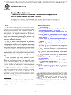 ASTM E3160-18 is a standard published by ASTM International. Its full title is "Standard Test Method for Quantitative Evaluation of the Antibacterial Properties of Porous Antibacterial Treated Articles". This standard covers: SIGNIFICANCE AND USE 5.1 Porous articles (often textiles) are often treated with antimicrobial agents to reduce the growth of microorganisms during use, in storage, or while waiting to be laundered, or both. Additionally, antimicrobial agents are added to reduce or control the overall microbial growth on porous articles that may affect the material’s odor, visual, chemical or physical integrity, or both. 5.2 Antimicrobial textile test methods that measure the antimicrobial behavior of treated textiles do exist but they are often specific for one type of antimicrobial agent or are designed to or may artificially (not expected in real life) promote the release of some specific antibacterial agents over others. This test method is designed to be able to measure the antimicrobial activity from all common antimicrobial agents used to treat porous articles, including textiles, without giving either positive or negative bias to one type of chemistry or product over another. 5.3 In an effort to avoid excessive use or abuse of antimicrobial agents in the environment, it is important to understand if untreated porous articles are susceptible to microbial contamination and growth. In this test method, a small amount of nutrients is added to each test sample in order to promote some microbial growth on susceptible test samples but not enough to overwhelm potential antimicrobial agents that may be effective in real life situations. Furthermore, low levels of nutrients allow investigators to add soiling agents that may be more reflective of a specific treated product’s end use or expected performance. 5.4 Very specific parameters are identified within this method to limit any variability that may be seen between laboratories. Identifying and clarifying potential variables found in other guides or methods used in the industry will allow for better reproducibility and repeatability between and within laboratories. 5.5 This test method provides the foundation for conducting tests on porous a... SCOPE 1.1 To determine the bactericidal or bacteriostatic properties of porous articles treated with an active biocidal agent, samples of porous treated materials, such as textiles or paper, are inoculated with a defined suspension of microorganisms and then incubated. The changes in numbers of the bacterial populations on the treated article are compared with untreated articles either over designated time or they are compared to the initial bacterial population at “zero time” for the treated article to measure antibacterial properties. 1.2 This test method is used for measuring the quantitative antibacterial activity of porous materials that have been treated with a biocide to inhibit the growth of bacteria on the treated materials. This method may also be used to measure the ability of the treated material to inhibit the growth of a microorganism. It can measure both bactericidal and bacteriostatic activity. 1.3 This test method shall be performed by individuals experienced and adept in microbiological procedures and in facilities suitable for the handling of the microorganisms under test. 1.4 This test method may involve hazardous materials, operations, and equipment. This standard does not purport to address all of the safety concerns, if any, associated with its use. It is the responsibility of the user of this standard to establish appropriate safety, health, and environmental practices and determine the applicability of regulatory limitations prior to use. 1.5 This international standard was developed in accordance with internationally recognized principles on standardization established in the Decision on Principles for the Development of International Standards, Guides and Recommendations issued by the World Trade Organization Technical Barriers to Trade (TBT) Committee.