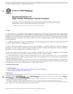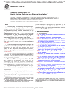 ASTM C578-23 is a technical specification published by ASTM International. Its full title is "Standard Specification for Rigid, Cellular Polystyrene Thermal Insulation". This standard covers: ABSTRACT This specification covers the standards for the types, physical properties and dimensions of cellular polystyrene boards with or without facings or coatings made by molding (EPS) or extrusion (XPS) of expandable polystyrene proposed for use as thermal insulation. This specification, however, does not cover laminated products manufactured with any type of rigid board facer including fiberboard, perlite board, gypsum board, or oriented strand board. All thermal insulation shall be of uniform density and shall contain sufficient flame retardants to meet the oxygen index of requirements. They shall also meet the physical requirements such as thermal resistance, compressive resistance, flexural strength, water vapor permeance, water absorption, dimensional stability, and oxygen index specified herein. SCOPE 1.1 This specification2 covers the types, physical properties, and dimensions of cellular polystyrene boards with or without facings or coatings made by molding (EPS) or extrusion (XPS) of expandable polystyrene. Products manufactured to this specification are intended for use as thermal insulation for temperatures from –65 to +165°F (–53.9 to +73.9°C). This specification does not apply to laminated products manufactured with any type of rigid board facer including fiberboard, perlite board, gypsum board, or oriented strand board. 1.1.1 Additional requirements for Types IV and XIII for pipe, tank, and equipment thermal insulation for temperatures from –320 to +165°F (–196 to +73.9°C) are contained in Annex A1. 1.2 The use of thermal insulation materials covered by this specification is potentially regulated by codes that address fire performance. For some end uses, specifiers need to also address the effect of moisture and wind pressure resistance. Guidelines regarding these end use considerations are included in Appendix X1. 1.3 The values stated in inch-pound units are to be regarded as standard. The values given in parentheses are mathematical conversions to SI units that are provided for information only and are not considered standard. 1.4 This standard does not purport to address all of the safety concerns, if any, associated with its use. It is the responsibility of the user of this standard to establish appropriate safety, health, and environmental practices and determine the applicability of regulatory limitations prior to use. 1.5 This international standard was developed in accordance with internationally recognized principles on standardization established in the Decision on Principles for the Development of International Standards, Guides and Recommendations issued by the World Trade Organization Technical Barriers to Trade (TBT) Committee.