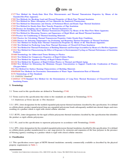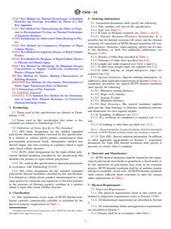 ABSTRACT This specification covers the standards for the types, physical properties and dimensions of cellular polystyrene boards with or without facings or coatings made by molding (EPS) or extrusion (XPS) of expandable polystyrene proposed for use as thermal insulation. This specification, however, does not cover laminated products manufactured with any type of rigid board facer including fiberboard, perlite board, gypsum board, or oriented strand board. All thermal insulation shall be of uniform density and shall contain sufficient flame retardants to meet the oxygen index of requirements. They shall also meet the physical requirements such as thermal resistance, compressive resistance, flexural strength, water vapor permeance, water absorption, dimensional stability, and oxygen index specified herein. SCOPE 1.1 This specification2 covers the types, physical properties, and dimensions of cellular polystyrene boards with or without facings or coatings made by molding (EPS) or extrusion (XPS) of expandable polystyrene. Products manufactured to this specification are intended for use as thermal insulation for temperatures from –65 to +165°F (–53.9 to +73.9°C). This specification does not apply to laminated products manufactured with any type of rigid board facer including fiberboard, perlite board, gypsum board, or oriented strand board. 1.1.1 Additional requirements for Types IV and XIII for pipe, tank, and equipment thermal insulation for temperatures from –320 to +165°F (–196 to +73.9°C) are contained in Annex A1. 1.2 The use of thermal insulation materials covered by this specification is potentially regulated by codes that address fire performance. For some end uses, specifiers need to also address the effect of moisture and wind pressure resistance. Guidelines regarding these end use considerations are included in Appendix X1. 1.3 The values stated in inch-pound units are to be regarded as standard. The values given in parentheses are mathematical conversions to SI units that are provided for information only and are not considered standard. 1.4 This standard does not purport to address all of the safety concerns, if any, associated with its use. It is the responsibility of the user of this standard to establish appropriate safety, health, and environmental practices and determine the applicability of regulatory limitations prior to use. 1.5 This international standard was developed in accordance with internationally recognized principles on standardization established in the Decision on Principles for the Development of International Standards, Guides and Recommendations issued by the World Trade Organization Technical Barriers to Trade (TBT) Committee.