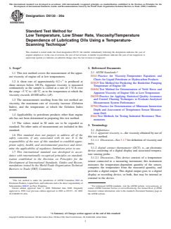 ASTM D5133-20a is a standard published by ASTM International. Its full title is "Standard Test Method for Low Temperature, Low Shear Rate, Viscosity/Temperature Dependence of Lubricating Oils Using a Temperature-Scanning Technique". This standard covers: SIGNIFICANCE AND USE 5.1 Significance of Low-Temperature, Low Shear Rate, Engine Oil Rheology—The low-temperature, low-shear viscometric behavior of an engine oil determines whether the oil will flow to the sump inlet screen, then to the oil pump, then to the sites in the engine requiring lubrication in sufficient quantity to prevent engine damage immediately or ultimately after cold temperature starting. 5.1.1 Two forms of flow problems have been identified,4 flow-limited and air-binding behavior. The first form of flow restriction, flow-limited behavior, is associated with the oil's viscosity; the second, air-binding behavior, is associated with gelation. 5.2 Significance of the Test Method—The temperature-scanning technique employed by this test method was designed to determine the susceptibility of the engine oil to flow-limited and air-binding response to slow cooling conditions by providing continuous information on the rheological condition of the oil over the temperature range of use.4,5,7 In this way, both viscometric and gelation response are obtained in one test. Note 1: This test method is one of three related to pumpability related problems. Measurement of low-temperature viscosity by the two other pumpability Test Methods D3829 and D4684, hold the sample in a quiescent state and generate the apparent viscosity of the sample at shear rates ranging up to 15 sec-1 and shear stresses up to 525 Pa at a previously selected temperature. Such difference in test parameters (shear rate, shear stress, sample motion, temperature scanning, and so forth) can lead to differences in the measured apparent viscosity among these test methods with some test oils, particularly when other rheological factors associated with gelation are present. In addition, the three methods differ considerably in cooling rates. 5.3 Gelation Index and Gelation Index Temperature—This test method has been further developed to yield parameters called the Gelation Index and Gelation Index temperature. T... SCOPE 1.1 This test method covers the measurement of the apparent viscosity of engine oil at low temperatures. 1.2 A shear rate of approximately 0.2 s-1 is produced at shear stresses below 100 Pa. Apparent viscosity is measured continuously as the sample is cooled at a rate of 1 °C/h over the range −5 °C to −40 °C, or to the temperature at which the viscosity exceeds 40 000 mPa·s (cP). 1.3 The measurements resulting from this test method are viscosity, the maximum rate of viscosity increase (Gelation Index), and the temperature at which the Gelation Index occurs. 1.4 Applicability to petroleum products other than engine oils has not been determined in preparing this test method. 1.5 The values stated in SI units are to be regarded as standard. No other units of measurement are included in this standard. 1.6 This standard does not purport to address all of the safety concerns, if any, associated with its use. It is the responsibility of the user of this standard to establish appropriate safety, health, and environmental practices and determine the applicability of regulatory limitations prior to use. 1.7 This international standard was developed in accordance with internationally recognized principles on standardization established in the Decision on Principles for the Development of International Standards, Guides and Recommendations issued by the World Trade Organization Technical Barriers to Trade (TBT) Committee.