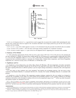 SIGNIFICANCE AND USE 5.1 Significance of Low-Temperature, Low Shear Rate, Engine Oil Rheology—The low-temperature, low-shear viscometric behavior of an engine oil determines whether the oil will flow to the sump inlet screen, then to the oil pump, then to the sites in the engine requiring lubrication in sufficient quantity to prevent engine damage immediately or ultimately after cold temperature starting. 5.1.1 Two forms of flow problems have been identified,4 flow-limited and air-binding behavior. The first form of flow restriction, flow-limited behavior, is associated with the oil's viscosity; the second, air-binding behavior, is associated with gelation. 5.2 Significance of the Test Method—The temperature-scanning technique employed by this test method was designed to determine the susceptibility of the engine oil to flow-limited and air-binding response to slow cooling conditions by providing continuous information on the rheological condition of the oil over the temperature range of use.4,5,7 In this way, both viscometric and gelation response are obtained in one test. Note 1: This test method is one of three related to pumpability related problems. Measurement of low-temperature viscosity by the two other pumpability Test Methods D3829 and D4684, hold the sample in a quiescent state and generate the apparent viscosity of the sample at shear rates ranging up to 15 sec-1 and shear stresses up to 525 Pa at a previously selected temperature. Such difference in test parameters (shear rate, shear stress, sample motion, temperature scanning, and so forth) can lead to differences in the measured apparent viscosity among these test methods with some test oils, particularly when other rheological factors associated with gelation are present. In addition, the three methods differ considerably in cooling rates. 5.3 Gelation Index and Gelation Index Temperature—This test method has been further developed to yield parameters called the Gelation Index and Gelation Index temperature. T... SCOPE 1.1 This test method covers the measurement of the apparent viscosity of engine oil at low temperatures. 1.2 A shear rate of approximately 0.2 s-1 is produced at shear stresses below 100 Pa. Apparent viscosity is measured continuously as the sample is cooled at a rate of 1 °C/h over the range −5 °C to −40 °C, or to the temperature at which the viscosity exceeds 40 000 mPa·s (cP). 1.3 The measurements resulting from this test method are viscosity, the maximum rate of viscosity increase (Gelation Index), and the temperature at which the Gelation Index occurs. 1.4 Applicability to petroleum products other than engine oils has not been determined in preparing this test method. 1.5 The values stated in SI units are to be regarded as standard. No other units of measurement are included in this standard. 1.6 This standard does not purport to address all of the safety concerns, if any, associated with its use. It is the responsibility of the user of this standard to establish appropriate safety, health, and environmental practices and determine the applicability of regulatory limitations prior to use. 1.7 This international standard was developed in accordance with internationally recognized principles on standardization established in the Decision on Principles for the Development of International Standards, Guides and Recommendations issued by the World Trade Organization Technical Barriers to Trade (TBT) Committee.
