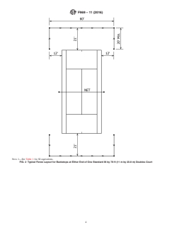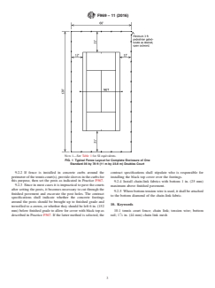 ASTM F969-11(2016) is a standard published by ASTM International. Its full title is "Standard Practice for Construction of Chain-Link Tennis Court Fence". This standard covers: SIGNIFICANCE AND USE 5.1 The intended use of this practice is for 10- or 12-ft (3050 or 3660 mm) high chain-link fencing as complete enclosures around single or multiple tennis courts, or as backstops at either end of tennis courts. 5.2 This practice is not intended for applications where fencing higher than 12 ft (3660 mm) is desired for a special application. 5.3 Caution Regarding Windscreens—If wind screens are to be installed at the time of fence erection or at a later time, it is advisable to use stronger framework and parts and closer spacing of posts or back bracing depending upon the type of screening material to be used, area of fence to be covered, and local wind conditions. The Chain Link Fence Manufacturers Institute’s (CLFMI), Guide WLG 2445, provides the designer with the process to select the post size and post spacing. SCOPE 1.1 This practice covers fencing around tennis courts, built from various types of chain-link fabric and framework materials, and installation practices for same. 1.2 The values stated in inch-pound units are to be regarded as standard. The values given in parentheses are mathematical conversions to SI units that are provided for information only and are not considered standard. 1.3 This standard does not purport to address all of the safety concerns, if any, associated with its use. It is the responsibility of the user of this standard to establish appropriate safety and health practices and determine the applicability of regulatory limitations prior to use.