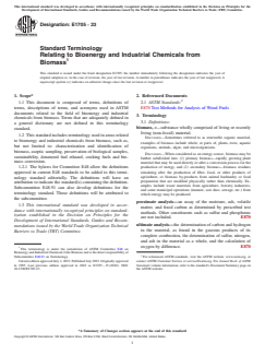 ASTM E1705-23 is a standard published by ASTM International. Its full title is "Standard Terminology Relating to Bioenergy and Industrial Chemicals from Biomass". This standard covers: SCOPE 1.1 This document is composed of terms, definitions of terms, descriptions of terms, and acronyms used in ASTM documents related to the field of bioenergy and industrial chemicals from biomass. Terms that are adequately defined in a general dictionary are not defined in this terminology standard. 1.2 This standard includes terminology used in areas related to bioenergy and industrial chemicals from biomass, such as, but not limited to: characterization and identification of biomass, aseptic sampling, preservation of biological samples, sustainability, denatured fuel ethanol, cooking fuels and biomass conversion. 1.2.1 The bylaws for Committee E48 allow the definitions approved in current E48 standards to be added to this terminology standard editorially. The definitions will have an attribution to indicate the standard(s) containing the definition. Subcommittee E48.91 can also develop definitions for the terminology standard. Those definitions will be attributed to the subcommittee. 1.3 This international standard was developed in accordance with internationally recognized principles on standardization established in the Decision on Principles for the Development of International Standards, Guides and Recommendations issued by the World Trade Organization Technical Barriers to Trade (TBT) Committee.