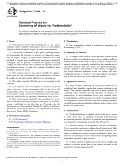 ASTM D5928-23 is a standard published by ASTM International. Its full title is "Standard Practice for Screening of Waste for Radioactivity". This standard covers: SIGNIFICANCE AND USE 5.1 Most facilities disposing or using waste materials are prohibited from handling wastes that contain radioactive materials. This practice provides the user a rapid method for screening waste material for the presence or absence of radioactivity at user-established levels that consider background radiation and the intended use of the screening method. It is important to these facilities to be able to verify generator-supplied information in regard to radiation and to meet worker health and safety needs. SCOPE 1.1 This practice covers the screening for α–, β–, and γ radiation above ambient background levels or user-defined criteria, or both, in liquid, sludge, or solid waste materials. 1.2 This practice is intended to be a gross screening method for determining the presence or absence of radioactive materials in liquid, sludge, or solid waste materials. It is not intended to replace more sophisticated quantitative analytical techniques, but to provide a method for rapidly screening samples for radioactivity above ambient background levels or user-defined criteria, or both, for facilities prohibited from handling radioactive waste. 1.3 This practice may or may not be suitable for applications such as site assessments and remediation activities, depending on the data quality objectives or intended use. 1.4 The values stated in SI units are to be regarded as the standard. 1.5 This standard does not purport to address all of the safety concerns, if any, associated with its use. It is the responsibility of the user of this standard to establish appropriate safety, health, and environmental practices and determine the applicability of regulatory limitations prior to use. 1.6 This international standard was developed in accordance with internationally recognized principles on standardization established in the Decision on Principles for the Development of International Standards, Guides and Recommendations issued by the World Trade Organization Technical Barriers to Trade (TBT) Committee.