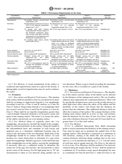 ABSTRACT This specification establishes the minimum performance requirements, classification, and test methods for synthetic surfaced running tracks. Even so, this specification does not imply that an injury cannot be incurred if the surface is found to be in compliance with this specification. The requirements for which newly installed synthetic surfaces shall be tested on and consequently comply to are imperfections, evenness, thickness, drainage, force reduction, modified vertical deformation, texture influence when wet, tensile properties, color in grey scale, weathering, spike resistance, and flammability. SCOPE 1.1 This specification establishes the minimum performance requirements and classification when tested in accordance with the procedures outlined within this specification. All documents referencing this specification must include classification required. 1.2 This specification does not imply that an injury cannot be incurred if the surface is found to be in compliance with this specification. 1.3 The values stated in SI units are to be regarded as standard. No other units of measurement are included in this standard. 1.4 This international standard was developed in accordance with internationally recognized principles on standardization established in the Decision on Principles for the Development of International Standards, Guides and Recommendations issued by the World Trade Organization Technical Barriers to Trade (TBT) Committee.