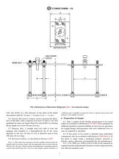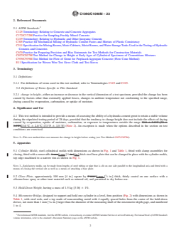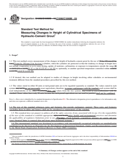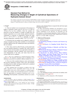 SIGNIFICANCE AND USE 4.1 This test method is intended to provide a means of assessing the ability of a hydraulic-cement grout to retain a stable volume during the stipulated testing period of 28 days, provided that the tendency to change height does not include the effects of drying caused by evaporation, uptake of moisture, carbonation, or exposure to temperatures outside the range 23.0 °C ± 2.0 °C [73 °F ± 3.5 °F] (Note 2). An exception is made when the options described in the section on test conditions are exercised. Note 2: This test method does not measure the change in height before setting (see Test Method C827/C827M). SCOPE 1.1 This test method covers measurement of the changes in height of hydraulic-cement grout by the use of 75 mm by 150 mm [3 in. by 6 in.] cylinders, when the cylinders are protected so that the tendency to change in height does not include evaporation so as to cause drying, uptake of moisture, carbonation, or exposure to temperatures outside the range 23 °C ± 2.0 °C [73 °F ± 3.5 °F] or, optionally, to another specified temperature controlled within ±2.0 °C [±3.5 °F]. 1.2 If desired, this test method can be adapted to studies of changes in height involving either schedules or environmental treatment different from the standard procedures prescribed by this test method. 1.3 The values stated in either SI units or inch-pound units are to be regarded separately as standard. The values stated in each system are not necessarily exact equivalents; therefore, to ensure conformance with the standard, each system shall be used independently of the other, and values from the two systems shall not be combined. Note 1: Sieve size is identified by its standard designation in Specification E11. The alternative designation given in parentheses is for information only and does not represent a different standard sieve size. 1.4 The text of this standard references notes and footnotes that provide explanatory material. These notes and footnotes (excluding those in tables and figures) shall not be considered as requirements of this standard. 1.5 This standard does not purport to address all of the safety concerns, if any, associated with its use. It is the responsibility of the user of this standard to establish appropriate safety, health, and environmental practices and determine the applicability of regulatory limitations prior to use. (Warning—Fresh hydraulic cementitious mixtures are caustic and may cause chemical burns to exposed skin and tissue upon prolonged exposure.2) 1.6 This international standard was developed in accordance with internationally recognized principles on standardization established in the Decision on Principles for the Development of International Standards, Guides and Recommendations issued by the World Trade Organization Technical Barriers to Trade (TBT) Committee.