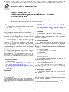 ASTM B475-07(2018) is a technical specification published by ASTM International. Its full title is "Standard Specification for UNS N08020, UNS N08024, and UNS N08026 Nickel Alloy Round Weaving Wire". This standard covers: ABSTRACT This specification covers UNS N08020, UNS N08026, and UNS N08024 round weaving wire. The material shall undergo solution-annealing heat treatment. The wire shall be annealed or cold drawn as a final operation to produce the specified tensile strength. The material shall conform to the required chemical composition for carbon, manganese, phosphorus, sulfur, silicon, nickel, chromium, molybdenum, copper, columbium+tantalum, nitrogen, and iron. The chemical composition and mechanical properties of the material as enumerated in this specification shall, in case of disagreement, be determined in accordance with the referenced ASTM documents for chemical analysis and tension test. SCOPE 1.1 This specification covers UNS N08020, UNS N08026, and UNS N08024 round weaving wire. Note 1: Weaving wire is customarily not welded. For applications involving welding in which the wire should be stabilized against loss of corrosion resistance, the purchaser should refer to Specification B473. 1.2 The values stated in inch-pound units are to be regarded as standard. The values given in parentheses are mathematical conversions to SI units that are provided for information only and are not considered standard. 1.3 This standard does not purport to address all of the safety concerns, if any, associated with its use. It is the responsibility of the user of this standard to become familiar with all hazards including those identified in the appropriate Safety Data Sheet (SDS) for this product/material as provided by the manufacturer, to establish appropriate safety, health, and environmental practices, and determine the applicability of regulatory limitations prior to use. 1.4 This international standard was developed in accordance with internationally recognized principles on standardization established in the Decision on Principles for the Development of International Standards, Guides and Recommendations issued by the World Trade Organization Technical Barriers to Trade (TBT) Committee.