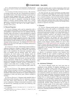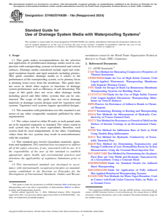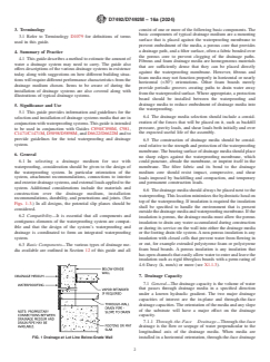 SIGNIFICANCE AND USE 5.1 This guide provides information and guidelines for the selection and installation of drainage systems media that are in conjunction with waterproofing systems. This guide is intended to be used in conjunction with Guides C898/C898M, C981, C1471/C1471M, D5898/D5898M, and D6622/D6622M and to provide guidelines for the total waterproofing and drainage system. SCOPE 1.1 This guide makes recommendations for the selection and application of prefabricated drainage media used in conjunction with waterproofing systems on horizontal and vertical surfaces. Drainage media considered include rigid and semi-rigid insulation boards and rigid materials including plastics. This guide considers drainage media as it relates to the performance of the waterproofing system, so its primary focus is draining water away from the membrane. This guide does not cover in detail other aspects or functions of drainage system performance such as efficiency of soil dewatering. The scope of this guide does not cover other drainage media including gravel and filter fabric systems that can be constructed. The scope of this guide does not cover drainage materials or drainage system designs used for vegetative roof systems. Vegetative roof systems require specialized designs. 1.2 The committee with jurisdiction over this standard is not aware of any other comparable standards published by other organizations. 1.3 The values stated in either SI units or inch-pound units are to be regarded separately as standard. The values stated in each system may not be exact equivalents; therefore, each system shall be used independently of the other. Combining values from the two systems may result in nonconformance with the standard. 1.4 This standard may involve hazardous materials, operations and equipment. This standard does not purport to address all of the safety concerns, if any, associated with its use. It is the responsibility of the user of this standard to establish appropriate safety, health, and environmental practices and determine the applicability of regulatory limitations prior to use. 1.5 This international standard was developed in accordance with internationally recognized principles on standardization established in the Decision on Principles for the Development of International Standards, Guides and Recommendations issued by the World Trade Organization Technical Barriers to Trade (TBT) Committee.