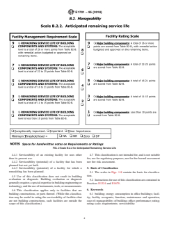 SIGNIFICANCE AND USE 4.1 Each facility rating scale in this classification (see Figs. 1-8) provides a means to estimate the level of serviceability of a building or facility for one topic of serviceability, and to compare that level against the level of any other building or facility. 4.2 This classification can be used for comparing how well different buildings or facilities meet a particular requirement for serviceability. It is applicable despite differences such aslocation, structure, mechanical systems, age, and building shape. 4.3 This classification can be used to estimate the amount of variance of serviceability from target or from requirement, for a single office facility, or within a group of office facilities. 4.4 This classification can be used to estimate the following: 4.4.1 Serviceability of an existing facility for uses other than its present use. 4.4.2 Serviceability (potential) of a facility that has been planned but not yet built. 4.4.3 Serviceability (potential) of a facility for which a remodeling has been planned. 4.5 Use of this classification does not result in building evaluation or diagnosis. Building evaluation or diagnosis generally requires a special expertise in building engineering or technology, and the use of instruments, tools, or measurements. 4.6 This classification applies only to facilities that are building constructions, or parts thereof. (While this classification may be useful in rating the serviceability of facilities that are not building constructions, such facilities are outside the scope of this classification.) 4.7 This classification is not intended for, and is not suitable for, use for regulatory purposes, nor for fire hazard assessment nor fire risk assessment. SCOPE 1.1 This classification covers pairs of scales (see Figs. 1-8) for classifying an aspect of the serviceability of an office facility, that is, the capability of an office facility to meet certain possible requirements for manageability. (A) The anticipated remaining service life on the items listed in this table should be on file, likely in an asset management plan for the facility. Otherwise, rating on this aspect of serviceability requires expert judgement on each item, and cannot be completed within a normal half-day site visit. If information is not available, then omit this item from the rating, and note that on the rating form.(B) Do not add pro rata counts for any remaining life that is estimated to be less than the threshold years given in the legend. The count in this table is not a sliding scale, for example, give all points or no points. 1.6 This international standard was developed in accordance with internationally recognized principles on standardization established in the Decision on Principles for the Development of International Standards, Guides and Recommendations issued by the World Trade Organization Technical Barriers to Trade (TBT) Committee.
