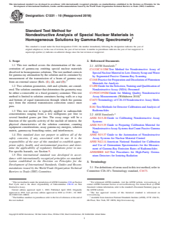 ASTM C1221-10(2018) is a standard published by ASTM International. Its full title is "Standard Test Method for Nondestructive Analysis of Special Nuclear Materials in Homogeneous Solutions by Gamma-Ray Spectrometry". This standard covers: SIGNIFICANCE AND USE 5.1 This test method is a nondestructive means of determining the nuclide concentration of a solution for special nuclear material accountancy, nuclear safety, and process control. 5.2 It is assumed that the nuclide to be analyzed is in a homogeneous solution (Practice C1168). 5.3 The transmission correction makes the test method independent of matrix (solution elemental composition and density) and useful over several orders of magnitude of nuclide concentrations. However, a typical configuration will normally span only two to three orders of magnitude because of detector dynamic range. 5.4 The test method assumes that the solution-detector geometry is the same for all measured items. This can be accomplished by requiring that the liquid height in the sidelooking geometry exceeds the detector field of view defined by the collimator. For the upward-looking geometry, a fixed solution fill height must be maintained and vials of identical radii must be used unless the vial radius exceeds the field of view defined by the collimator. 5.5 Since gamma-ray systems can be automated, the test method can be rapid, reliable, and not labor intensive. 5.6 This test method may be applicable to in-line or off-line situations. SCOPE 1.1 This test method covers the determination of the concentration of gamma-ray emitting special nuclear materials dissolved in homogeneous solutions. The test method corrects for gamma-ray attenuation by the solution and its container by measurement of the transmission of a beam of gamma rays from an external source (Refs. (1), (2), and (3)).2 1.2 Two solution geometries, slab and cylinder, are considered. The solution container that determines the geometry may be either a removable or a fixed geometry container. This test method is limited to solution containers having walls or a top and bottom of equal transmission through which the gamma rays from the external transmission correction source must pass. 1.3 This test method is typically applied to radionuclide concentrations ranging from a few milligrams per litre to several hundred grams per litre. The assay range will be a function of the specific activity of the nuclide of interest, the physical characteristics of the solution container, counting equipment considerations, assay gamma-ray energies, solution matrix, gamma-ray branching ratios, and interferences. 1.4 This standard does not purport to address all of the safety concerns, if any, associated with its use. It is the responsibility of the user of this standard to establish appropriate safety, health, and environmental practices and determine the applicability of regulatory limitations prior to use. For specific hazards, see Section 9. 1.5 This international standard was developed in accordance with internationally recognized principles on standardization established in the Decision on Principles for the Development of International Standards, Guides and Recommendations issued by the World Trade Organization Technical Barriers to Trade (TBT) Committee.