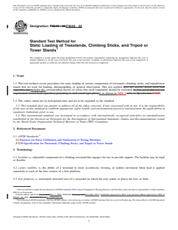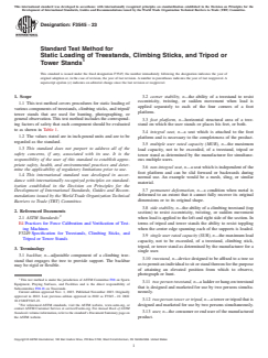 ASTM F3545-23 is a standard published by ASTM International. Its full title is "Standard Test Method for Static Loading of Treestands, Climbing Sticks, and Tripod or Tower Stands". This standard covers: SCOPE 1.1 This test method covers procedures for static loading of various components of treestands, climbing sticks, and tripod/tower stands that are used for hunting, photographing, or general observation. This test method includes the corresponding factors of safety that each component should be evaluated to as shown in Table 1. 1.2 The values stated are in inch-pound units and are to be regarded as the standard. 1.3 This standard does not purport to address all of the safety concerns, if any, associated with its use. It is the responsibility of the user of this standard to establish appropriate safety, health, and environmental practices and determine the applicability of regulatory limitations prior to use. 1.4 This international standard was developed in accordance with internationally recognized principles on standardization established in the Decision on Principles for the Development of International Standards, Guides and Recommendations issued by the World Trade Organization Technical Barriers to Trade (TBT) Committee.