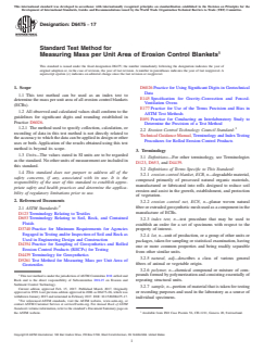 ASTM D6475-17 is a standard published by ASTM International. Its full title is "Standard Test Method for Measuring Mass per Unit Area of Erosion Control Blankets". This standard covers: SIGNIFICANCE AND USE 5.1 This test method is used to determine if the ECB meets specifications for mass per unit area. This measurement allows for a simple control of the delivered material by a comparison of the mass per unit area of the delivered material and the specified mass per unit area. 5.2 The procedure in this test method may be used for acceptance testing of commercial shipments, but caution is advised since information about between-laboratory precision is incomplete. 5.3 Testing under this standard shall conform to the requirements of Practice D3740. SCOPE 1.1 This test method can be used as an index test to determine the mass per unit area of all erosion control blankets (ECBs). 1.2 All observed and calculated values shall conform to the guidelines for significant digits and rounding established in Practice D6026. 1.2.1 The method used to specify collection, calculation, or recording of data in this test method is not directly related to the accuracy to which the data can be applied in design or other uses or both. Application of the results obtained using this test method is beyond its scope. 1.3 Units—The values stated in SI units are to be regarded as the standard. No other units of measurement are included in this standard. 1.4 This standard does not purport to address all of the safety concerns, if any, associated with its use. It is the responsibility of the user of this standard to establish appropriate safety and health practices and determine the applicability of regulatory limitations prior to use.