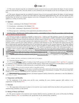 SIGNIFICANCE AND USE 4.1 This test method provides a means for determining the ability of mortars and plasters to retain water under suction. Test results may be used to determine compliance with specifications. 4.2 The results obtained using this test method can be used to compare the relative ability of mortars and plasters to retain water under suction. 4.3 The results obtained using this test method for masonry mortars do not necessarily indicate the degree of water retention when used with masonry units, since the amount of water absorbed by the unit depends on the rate of absorption of the masonry unit. 4.4 The results obtained using this test method for plasters (stucco) do not necessarily indicate the degree of water retention when the plaster is applied as a second coat on the surface of a previously applied plaster base coat, since the amount of water absorbed from the second coat of plaster depends on the rate of absorption of the base coat. This is also true when a plaster is applied as a coating on masonry units. SCOPE 1.1 This test method provides for the determination of water retention of hydraulic cement-based mortars and plasters. 1.2 The values stated in SI units are to be regarded as standard. No other units of measurement are included in this standard. When this test method refers to combined-unit standards, the selection of the measurement systems is at the user’s discretion. 1.3 This standard does not purport to address all of the safety concerns, if any, associated with its use. It is the responsibility of the user of this standard to establish appropriate safety, health and environmental practices and determine the applicability of regulatory limitations prior to use. (Warning—Fresh hydraulic cementitious mixtures are caustic and may cause chemical burns to skin and tissue upon prolonged exposure.)2 1.4 This international standard was developed in accordance with internationally recognized principles on standardization established in the Decision on Principles for the Development of International Standards, Guides and Recommendations issued by the World Trade Organization Technical Barriers to Trade (TBT) Committee.
