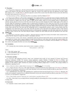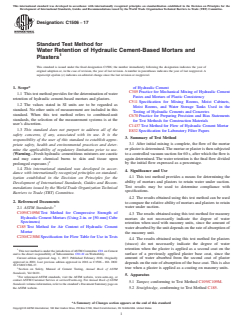 ASTM C1506-17 is a standard published by ASTM International. Its full title is "Standard Test Method for Water Retention of Hydraulic Cement-Based Mortars and Plasters". This standard covers: SIGNIFICANCE AND USE 4.1 This test method provides a means for determining the ability of mortars and plasters to retain water under suction. Test results may be used to determine compliance with specifications. 4.2 The results obtained using this test method can be used to compare the relative ability of mortars and plasters to retain water under suction. 4.3 The results obtained using this test method for masonry mortars do not necessarily indicate the degree of water retention when used with masonry units, since the amount of water absorbed by the unit depends on the rate of absorption of the masonry unit. 4.4 The results obtained using this test method for plasters (stucco) do not necessarily indicate the degree of water retention when the plaster is applied as a second coat on the surface of a previously applied plaster base coat, since the amount of water absorbed from the second coat of plaster depends on the rate of absorption of the base coat. This is also true when a plaster is applied as a coating on masonry units. SCOPE 1.1 This test method provides for the determination of water retention of hydraulic cement-based mortars and plasters. 1.2 The values stated in SI units are to be regarded as standard. No other units of measurement are included in this standard. When this test method refers to combined-unit standards, the selection of the measurement systems is at the user’s discretion. 1.3 This standard does not purport to address all of the safety concerns, if any, associated with its use. It is the responsibility of the user of this standard to establish appropriate safety, health and environmental practices and determine the applicability of regulatory limitations prior to use. (Warning—Fresh hydraulic cementitious mixtures are caustic and may cause chemical burns to skin and tissue upon prolonged exposure.)2 1.4 This international standard was developed in accordance with internationally recognized principles on standardization established in the Decision on Principles for the Development of International Standards, Guides and Recommendations issued by the World Trade Organization Technical Barriers to Trade (TBT) Committee.