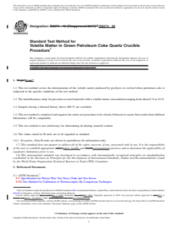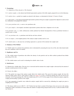 SIGNIFICANCE AND USE 5.1 The volatile matter of petroleum coke affects the density of coke particles and can affect artifacts produced from further processing of the coke. 5.2 The volatile matter can be used in estimating the calorific value of coke. SCOPE 1.1 This test method covers the determination of the volatile matter produced by pyrolysis or evolved when petroleum coke is subjected to the specific conditions of the test method. 1.2 The interlaboratory study for precision covered materials with a volatile matter concentration ranging from about 8 % to 16 %. 1.3 Samples having a thermal history above 600 °C are excluded. 1.4 This test method is empirical and requires the entire test procedure to be closely followed to ensure that results from different laboratories will be comparable. 1.5 This test method is not satisfactory for determining de-dusting material content. 1.6 The values stated in SI units are to be regarded as standard. 1.6.1 Exception—Non-SI units are shown in parentheses for information only. 1.7 This standard does not purport to address all of the safety concerns, if any, associated with its use. It is the responsibility of the user to establish appropriate safety, health, and environmental practices and to determine the applicability of regulatory limitations prior to use. 1.8 This international standard was developed in accordance with internationally recognized principles on standardization established in the Decision on Principles for the Development of International Standards, Guides and Recommendations issued by the World Trade Organization Technical Barriers to Trade (TBT) Committee.