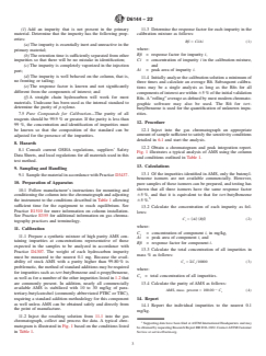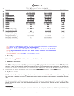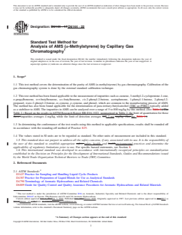 SIGNIFICANCE AND USE 5.1 This test method is suitable for setting specifications on the materials referenced in 1.2 and for use as an internal quality control tool where AMS is produced or is used in a manufacturing process. It may also be used in development or research work involving AMS. 5.2 This test method is useful in determining the purity of AMS with normal impurities present. If extremely high boiling or unusual impurities are present in the AMS, this test method would not necessarily detect them and the purity calculation would be erroneous. SCOPE 1.1 This test method covers the determination of the purity of AMS (α-methylstyrene) by gas chromatography. Calibration of the gas chromatography system is done by the external standard calibration technique. 1.2 This test method has been found applicable to the measurement of impurities such as cumene, 3-methyl-2-cyclopentene-1-one, n-propylbenzene, tert-butylbenzene, sec-butylbenzene, cis-2-phenyl-2-butene, acetophenone, 1-phenyl-1-butene, 2-phenyl-2-propanol, trans-2-phenyl-2-butene, m-cymene, p-cymene, and phenol, which are common to the manufacturing process of AMS. The method has also been found applicable for the determination of para-tertiary-butylcatechol (TBC or PTBC) typically added as a stabilizer to AMS. The impurities in AMS can be analyzed over a range of 5 to 800 mg/kg by this method. (See Table 2.) Based on the results in ASTM Research Report RR:D16-1022, summarized in Table 2, the limit of quantitation for these impurities averages 4 mg/kg, while the limit of detection averages 1.2 mg/kg. 1.3 In determining the conformance of the test results using this method to applicable specifications, results shall be rounded off in accordance with the rounding-off method of Practice E29. 1.4 The values stated in SI units are to be regarded as standard. No other units of measurement are included in this standard. 1.5 This standard does not purport to address all the safety concerns, if any, associated with its use. It is the responsibility of the user of this standard to establish appropriate safety, health, and environmental practices and determine the applicability of regulatory limitations prior to use. For specific hazard statements, see Section 8. 1.6 This international standard was developed in accordance with internationally recognized principles on standardization established in the Decision on Principles for the Development of International Standards, Guides and Recommendations issued by the World Trade Organization Technical Barriers to Trade (TBT) Committee.