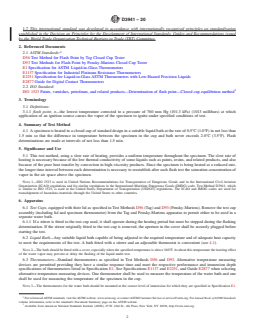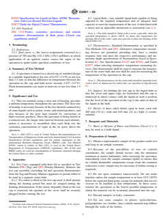 SIGNIFICANCE AND USE 5.1 This test method, using a slow rate of heating, provides a uniform temperature throughout the specimen. The slow rate of heating is necessary because of the low thermal conductivity of some liquids such as paints, resins, and related products, and also because of the poor heat transfer by convection in high-viscosity products. Since the specimen is being heated at a reduced rate, the longer time interval between each determination is necessary to reestablish after each flash test the saturation concentration of vapor in the air space above the specimen. Note 1: ISO 1523 is used in United Nations Recommendations for Transportation of Dangerous Goods and in the International Civil Aviation Organization (ICAO) regulations and for similar regulations in the International Maritime Dangerous Goods (IMDG) code. Test Method D3941, which is similar to ISO 1523, is used in the United States Department of Transportation (USDOT) regulations. The ICAO and IMDG codes are used for transshipment of hazardous materials through the United States to other countries. SCOPE 1.1 This test method covers the determination of the flash point of liquids in which the specimen and the air/vapor mixture above it are approximately in temperature equilibrium. 1.2 This test method is limited to a temperature range from 0 to 110°C (32 to 230°F). 1.3 The values stated in SI units are to be regarded as the standard. The values given in parentheses are for information only. 1.4 Warning—Mercury has been designated by many regulatory agencies as a hazardous substance that can cause serious medical issues. Mercury, or its vapor, has been demonstrated to be hazardous to health and corrosive to materials. Use caution when handling mercury and mercury-containing products. See the applicable product Safety Data Sheet (SDS) for additional information. The potential exists that selling mercury or mercury-containing products, or both, is prohibited by local or national law. Users must determine legality of sales in their location. 1.5 This standard is used to measure and describe the response of materials, products, or assemblies to heat and flame under controlled conditions, but does not by itself incorporate all factors required for fire hazard or fire risk assessment of the materials, products, or assemblies under actual fire conditions. 1.6 This standard does not purport to address all of the safety concerns, if any, associated with its use. It is the responsibility of the user of this standard to establish appropriate safety, health, and environmental practices and determine the applicability of regulatory limitations prior to use. 1.7 This international standard was developed in accordance with internationally recognized principles on standardization established in the Decision on Principles for the Development of International Standards, Guides and Recommendations issued by the World Trade Organization Technical Barriers to Trade (TBT) Committee.