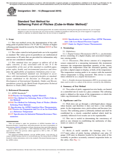 ASTM D61-15(2019) - Standard Test Method for Softening Point of Pitches (Cube-in-Water Method) defines a standardized procedure for determining the softening point of pitches with softening points below 176 °F (80 °C). Pitch materials, which do not exhibit a true melting point due to their gradual softening on heating, require a controlled method for reproducible and comparable results. Developed by ASTM International, this test method is widely recognized in the assessment of pitch properties related to consistency and quality control across various industries.