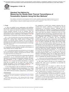 ASTM C1199-22 is a standard published by ASTM International. Its full title is "Standard Test Method for Measuring the Steady-State Thermal Transmittance of Fenestration Systems Using Hot Box Methods". This standard covers: SIGNIFICANCE AND USE 4.1 This test method details the calibration and testing procedures and necessary additional temperature instrumentation required in applying Test Method C1363 to measure the thermal transmittance of fenestration systems mounted vertically in the thermal chamber. 4.2 The thermal transmittance of a test specimen is affected by its size and three-dimensional geometry. Care must be exercised when extrapolating to product sizes smaller or larger than the test specimen. Therefore, it is recommended that fenestration systems be tested at the recommended sizes specified in Practice E1423 or NFRC 100. 4.3 Since both temperature and surface heat transfer coefficient conditions affect results, use of recommended conditions will assist in reducing confusion caused by comparing results of tests performed under dissimilar conditions. Standardized test conditions for determining the thermal transmittance of fenestration systems are specified in Practice E1423 and Section 6.2. The performance of a test specimen measured at standardized test conditions is potentially different than the performance of the same fenestration product when installed in the wall of a building located outdoors. Standardized test conditions often represent extreme summer or winter design conditions, which are potentially different than the average conditions typically experienced by a fenestration product installed in an exterior wall. For the purpose of comparison, it is essential to calibrate with surface heat transfer coefficients on the Calibration Transfer Standard (CTS) which are as close as possible to the conventionally accepted values for building design; however, this procedure can be used at other conditions for research purposes or product development. 4.4 Similarly, it would be desirable to have a surround panel that closely duplicates the actual wall where the fenestration system would be installed. Since there are such a wide variety of fenestration system openings in North American... SCOPE 1.1 This test method covers requirements and guidelines and specifies calibration procedures required for the measurement of the steady-state thermal transmittance of fenestration systems installed vertically in the test chamber. This test method specifies the necessary measurements to be made using measurement systems conforming to Test Method C1363 for determination of fenestration system thermal transmittance. Note 1: This test method allows the testing of projecting fenestration products (that is, garden windows, skylights, and roof windows) installed vertically in a surround panel. Current research on skylights, roof windows, and projecting products hopefully will provide additional information that can be added to the next version of this test method so that skylight and roof windows can be tested horizontally or at some angle typical of a sloping roof. 1.2 This test method refers to the thermal transmittance, U of a fenestration system installed vertically in the absence of solar radiation and air leakage effects. Note 2: The methods described in this document may also be adapted for use in determining the thermal transmittance of sections of building wall, and roof and floor assemblies containing thermal anomalies, which are smaller than the hot box metering area. 1.3 This test method describes how to determine the thermal transmittance, US of a fenestration product (also called test specimen) at well-defined environmental conditions. The thermal transmittance is also a reported test result from Test Method C1363. If only the thermal transmittance is reported using this test method, the test report must also include a detailed description of the environmental conditions in the thermal chamber during the test as outlined in 10.1.14. 1.4 For rating purposes, this test method also describes how to calculate a standardized thermal transmittance, UST, which can be used to compare test results from labor...