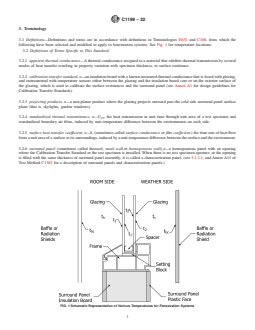 SIGNIFICANCE AND USE 4.1 This test method details the calibration and testing procedures and necessary additional temperature instrumentation required in applying Test Method C1363 to measure the thermal transmittance of fenestration systems mounted vertically in the thermal chamber. 4.2 The thermal transmittance of a test specimen is affected by its size and three-dimensional geometry. Care must be exercised when extrapolating to product sizes smaller or larger than the test specimen. Therefore, it is recommended that fenestration systems be tested at the recommended sizes specified in Practice E1423 or NFRC 100. 4.3 Since both temperature and surface heat transfer coefficient conditions affect results, use of recommended conditions will assist in reducing confusion caused by comparing results of tests performed under dissimilar conditions. Standardized test conditions for determining the thermal transmittance of fenestration systems are specified in Practice E1423 and Section 6.2. The performance of a test specimen measured at standardized test conditions is potentially different than the performance of the same fenestration product when installed in the wall of a building located outdoors. Standardized test conditions often represent extreme summer or winter design conditions, which are potentially different than the average conditions typically experienced by a fenestration product installed in an exterior wall. For the purpose of comparison, it is essential to calibrate with surface heat transfer coefficients on the Calibration Transfer Standard (CTS) which are as close as possible to the conventionally accepted values for building design; however, this procedure can be used at other conditions for research purposes or product development. 4.4 Similarly, it would be desirable to have a surround panel that closely duplicates the actual wall where the fenestration system would be installed. Since there are such a wide variety of fenestration system openings in North American... SCOPE 1.1 This test method covers requirements and guidelines and specifies calibration procedures required for the measurement of the steady-state thermal transmittance of fenestration systems installed vertically in the test chamber. This test method specifies the necessary measurements to be made using measurement systems conforming to Test Method C1363 for determination of fenestration system thermal transmittance. Note 1: This test method allows the testing of projecting fenestration products (that is, garden windows, skylights, and roof windows) installed vertically in a surround panel. Current research on skylights, roof windows, and projecting products hopefully will provide additional information that can be added to the next version of this test method so that skylight and roof windows can be tested horizontally or at some angle typical of a sloping roof. 1.2 This test method refers to the thermal transmittance, U of a fenestration system installed vertically in the absence of solar radiation and air leakage effects. Note 2: The methods described in this document may also be adapted for use in determining the thermal transmittance of sections of building wall, and roof and floor assemblies containing thermal anomalies, which are smaller than the hot box metering area. 1.3 This test method describes how to determine the thermal transmittance, US of a fenestration product (also called test specimen) at well-defined environmental conditions. The thermal transmittance is also a reported test result from Test Method C1363. If only the thermal transmittance is reported using this test method, the test report must also include a detailed description of the environmental conditions in the thermal chamber during the test as outlined in 10.1.14. 1.4 For rating purposes, this test method also describes how to calculate a standardized thermal transmittance, UST, which can be used to compare test results from labor...