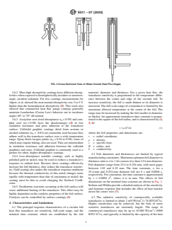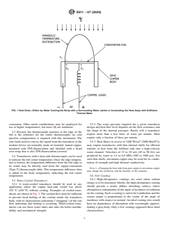 SIGNIFICANCE AND USE 3.1 Fig. 1 is a sectional view of an example circular foil heat-flux transducer. It consists of a circular Constantan foil attached by a metallic bonding process to a heat sink of oxygen-free high conductivity copper (OFHC), with copper leads attached at the center of the circular foil and at any point on the heat-sink body. The transducer impedance is usually less than 1 V. To minimize current flow, the data acquisition system (DAS) should be a potentiometric system or have an input impedance of at least 100 000 Ω. 3.2 As noted in 2.3, an approximately linear output (versus heat flux) is produced when the body and center wire of the transducer are constructed of copper and the circular foil is constantan. Other metal combinations may be employed for use at higher temperatures, but most (4) are nonlinear. 3.3 Because the thermocouple junction at the edge of the foil is the reference for the center thermocouple, no cold junction compensation is required with this instrument. The wire leads used to convey the signal from the transducer to the readout device are normally made of stranded, tinned copper, insulated with TFE-fluorocarbon and shielded with a braid over-wrap that is also TFE-fluorocarbon-covered. 3.4 Transducers with a heat-sink thermocouple can be used to indicate the foil center temperature. Once the edge temperature is known, the temperature difference from the foil edge to its center may be directly read from the copper-constantan (Type T) thermocouple table. This temperature difference then is added to the body temperature, indicating the foil center temperature. 3.5 Water-Cooled Transducer: 3.5.1 A water-cooled transducer should be used in any application where the copper heat-sink would rise above 235 °C (450 °F) without cooling. Examples of cooled transducers are shown in Fig. 2. The coolant flow must be sufficient to prevent local boiling of the coolant inside the transducer body, with its characteristic pulsations (“chugging”) of t... SCOPE 1.1 This test method describes the measurement of radiative heat flux using a transducer whose sensing element (1, 2)2 is a thin circular metal foil. These sensors are often called Gardon Gauges. 1.2 The values stated in SI units are to be regarded as the standard. The values stated in parentheses are provided for information only. 1.3 This standard does not purport to address all of the safety concerns, if any, associated with its use. It is the responsibility of the user of this standard to establish appropriate safety, health, and environmental practices and determine the applicability of regulatory limitations prior to use. 1.4 This international standard was developed in accordance with internationally recognized principles on standardization established in the Decision on Principles for the Development of International Standards, Guides and Recommendations issued by the World Trade Organization Technical Barriers to Trade (TBT) Committee.