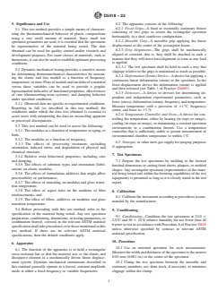 SIGNIFICANCE AND USE 5.1 This test method provides a simple means of characterizing the thermomechanical behavior of plastic compositions using a very small amount of material. Since small test specimen geometries are used, it is essential that the specimens be representative of the material being tested. The data obtained can be used for quality control and/or research and development purposes. For some classes of materials, such as thermosets, it can also be used to establish optimum processing conditions. 5.2 Dynamic mechanical testing provides a sensitive means for determining thermomechanical characteristics by measuring the elastic and loss moduli as a function of frequency, temperature, or time. Plots of moduli and tan delta of a material versus these variables can be used to provide a graphic representation indicative of functional properties, effectiveness of cure (thermosetting-resin systems), and damping behavior under specified conditions. 5.2.1 Observed data are specific to experimental conditions. Reporting in full (as described in this test method) the conditions under which the data was obtained is essential to assist users with interpreting the data an reconciling apparent or perceived discrepancies. 5.3 This test method can be used to assess the following: 5.3.1 The modulus as a function of temperature or aging, or both, 5.3.2 The modulus as a function of frequency, 5.3.3 The effects of processing treatment, including orientation, induced stress, and degradation of physical and chemical structure, 5.3.4 Relative resin behavioral properties, including cure and damping, 5.3.5 The effects of substrate types and orientation (fabrication) on elastic modulus, 5.3.6 The effects of formulation additives that might affect processability or performance, 5.3.7 The effects of annealing on modulus and glass transition temperature, 5.3.8 The effect of aspect ratio on the modulus of fiber reinforcements, and 5.3.9 The effect of fillers, additives ... SCOPE 1.1 This test method outlines the use of dynamic mechanical instrumentation for determining and reporting the viscoelastic properties of thermoplastic and thermosetting resins and composite systems in the form of rectangular bars molded directly or cut from sheets, plates, or molded shapes. The elastic modulus data generated is used to identify the thermomechanical properties of a plastics material or composition. 1.2 This test method is intended to provide a means for determining the viscoelastic properties of a wide variety of plastics using nonresonant, forced-vibration techniques as outlined in Practice D4065. In particular, this method identifies the procedures used to measure properties using what is known as a dual-cantilever beam flexure arrangement. Plots of the elastic (storage) modulus, loss (viscous) modulus, and complex modulus, and tan delta as a function of frequency, time, or temperature are indicative of significant transitions in the thermomechanical performance of the polymeric material systems. 1.3 This test method is valid for a wide range of frequencies, typically from 0.01 Hz to 100 Hz. 1.4 Test data obtained by this test method are relevant and appropriate for use in engineering design. 1.5 The values stated in SI units are to be regarded as standard. 1.6 This standard does not purport to address all of the safety concerns, if any, associated with its use. It is the responsibility of the user of this standard to establish appropriate safety, health, and environmental practices and determine the applicability of regulatory limitations prior to use. Note 1: There is no known ISO equivalent to this standard. 1.7 This international standard was developed in accordance with internationally recognized principles on standardization established in the Decision on Principles for the Development of International Standards, Guides and Recommendations issued by the World Trade Organization...