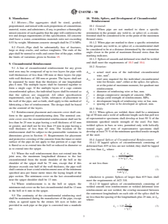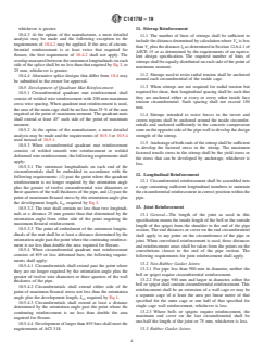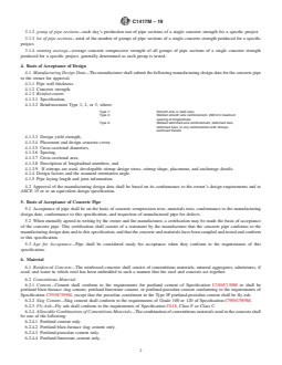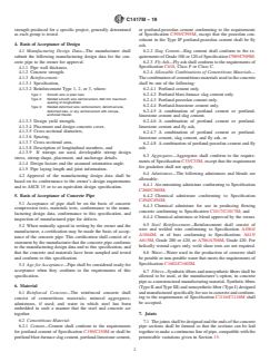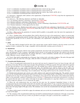 ABSTRACT This specification covers the manufacture and acceptance of reinforced concrete sewer, storm drain, and culvert pipe designed to conform to the owner's design requirements and to equivalent design specification. The reinforced concrete shall consist of cementitious materials; mineral aggregates; admixtures, if used; and water. The cementitious material shall be composed of cement, ground graduated blast-furnace; fly ash; allowable combinations of cementitious materials; a combination of Portland cement and ground granulated blast-furnace slag; a combination of Portland cement and fly ash; or a combination of Portland cement, ground granulated blast-furnace slag, and fly ash; aggregates; admixtures; air-entraining admixture; chemical admixtures; and steel reinforcement. The joints shall be designed and the ends of the concrete pipe sections shall be formed so that the sections can be laid together to make a continuous line of pipe. The pipe shall conform to the requirements of circumferential reinforcement, longitudinal reinforcement, and joint reinforcement. The specimen shall conform to the specified physical requirements after undertaking the following test procedures: concrete compressive strength testing; acceptance by cylinder tests; and acceptance by core tests. SCOPE 1.1 This specification covers the manufacture and acceptance of precast concrete pipe designed to conform to the owner's design requirements and to the ASCE 15 or an equivalent design specification. Note 1: The section on evaluation of core test results (14.3.3) and the Appendix are currently being reballoted. 1.2 This specification is the SI companion to Specification C1417. 1.3 This international standard was developed in accordance with internationally recognized principles on standardization established in the Decision on Principles for the Development of International Standards, Guides and Recommendations issued by the World Trade Organization Technical Barriers to Trade (TBT) Committee.