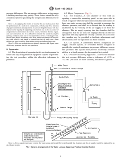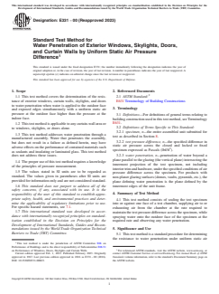 SIGNIFICANCE AND USE 5.1 This test method is a standard procedure for determining the resistance to water penetration under uniform static air pressure differences. The air-pressure differences acting across a building envelope vary greatly. These factors should be fully considered prior to specifying the test pressure difference to be used. Note 1: In applying the results of tests by this test method, note that the performance of a wall or its components, or both, may be a function of proper installation and adjustment. In service, the performance will also depend on the rigidity of supporting construction and on the resistance of components to deterioration by various causes, vibration, thermal expansion and contraction, etc. It is difficult to simulate the identical complex wetting conditions that can be encountered in service, with large wind-blown water drops, increasing water drop impact pressures with increasing wind velocity, and lateral or upward moving air and water. Some designs are more sensitive than others to this upward moving water. Note 2: This test method does not identify unobservable liquid water which may penetrate into the test specimen. SCOPE 1.1 This test method covers the determination of the resistance of exterior windows, curtain walls, skylights, and doors to water penetration when water is applied to the outdoor face and exposed edges simultaneously with a uniform static air pressure at the outdoor face higher than the pressure at the indoor face. 1.2 This test method is applicable to any curtain-wall area or to windows, skylights, or doors alone. 1.3 This test method addresses water penetration through a manufactured assembly. Water that penetrates the assembly, but does not result in a failure as defined herein, may have adverse effects on the performance of contained materials such as sealants and insulating or laminated glass. This test method does not address these issues. 1.4 The proper use of this test method requires a knowledge of the principles of pressure measurement. 1.5 The values stated in SI units are to be regarded as standard. The values given in parentheses after SI units are provided for information only and are not considered standard. 1.6 This standard does not purport to address all of the safety concerns, if any, associated with its use. It is the responsibility of the user of this standard to establish appropriate safety, health, and environmental practices and determine the applicability of regulatory limitations prior to use. For specific hazard statements, see 7.1. 1.7 This international standard was developed in accordance with internationally recognized principles on standardization established in the Decision on Principles for the Development of International Standards, Guides and Recommendations issued by the World Trade Organization Technical Barriers to Trade (TBT) Committee.