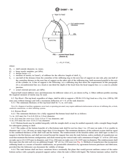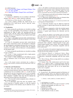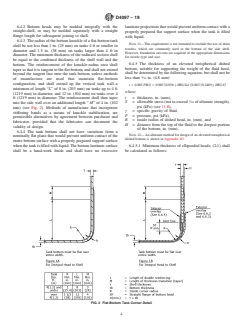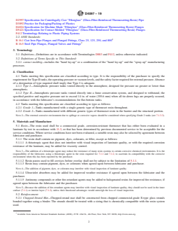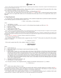 ABSTRACT This specification covers cylindrical tanks fabricated by contact molding for above-ground vertical installation, to contain aggressive chemicals at essentially atmospheric pressure, and made of a commercial-grade polyester or vinyl ester, resin. This specification does not cover the design of vessels intended for pressure above hydrostatic, vacuum conditions, except as classified herein, or vessels intended for use with liquids heated above their flash points. The tanks are classified as type I and II according to the operating pressure or vacuum levels, and the safety factor required for external pressure. The tanks are further classified as grade 1 and 2 according to the generic types of thermoset resin. The resin used shall be a commercial grade, corrosion-resistant thermoset. The reinforcement should be a chopped-strand mat, a nonwoven biaxial or unidirectal fabric, a woven roving, or a surface mat. Materials shall be tested and the individual grades shall conform to specified values of design requirements such as straight shell, external pressure, top head, bottom head, open-top tanks, joints, fittings, hold-down lugs, and lifting lugs; laminate construction requirements such as structural tank, joints, and fittings and accessories; and other requirements such as physical properties, chemical resistance of resin, glass content, tensile strength, flexural properties and degree of cure. The dimensions and tolerances, as well as the workmanship, finish and appearance are also detailed. SCOPE 1.1 This specification covers cylindrical tanks fabricated by contact molding for above-ground vertical installation, to contain aggressive chemicals at atmospheric pressure, and made of a commercial-grade polyester or vinyl ester, resin. Included are requirements for materials, properties, design, construction, dimensions, tolerances, workmanship, and appearance. 1.2 This specification does not cover the design of vessels intended for pressure above atmospheric or under vacuum conditions, except as classified herein, or vessels intended for use with liquids heated above their flash points. 1.3 The values stated in inch-pound units are to be regarded as standard. The values given in parentheses are provided for information purposes only. 1.4 Special design consideration shall be given to tanks subject to environmental and/or mechanical forces such seismic, wind, ice, agitation, or fluid dynamic forces, to operational service temperatures greater than 180°F (82°C) and to tanks with unsupported bottoms. 1.5 The following safety hazards caveat pertains only to the test method portion, Section 11, of this specification: This standard does not purport to address all of the safety concerns, if any, associated with its use. It is the responsibility of the user of this standard to establish appropriate safety, health, and environmental practices and determine the applicability of regulatory limitations prior to use. Note 1: There is no known ISO equivalent to this standard. 1.6 This international standard was developed in accordance with internationally recognized principles on standardization established in the Decision on Principles for the Development of International Standards, Guides and Recommendations issued by the World Trade Organization Technical Barriers to Trade (TBT) Committee.