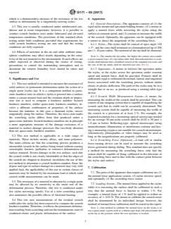 5.1 This test method is intended to measure the resistance of solid surfaces to permanent deformation under the action of a single point (stylus tip). It is a companion method to quasi-static hardness tests in which a stylus is pressed into a surface under a certain normal load and the resultant depth or impression size is used to compute a hardness number. Scratch hardness numbers, unlike quasi-static hardness numbers, involve a different combination of properties of the surface because the indenter, in this case a diamond stylus, moves tangentially along the surface. Therefore, the stress state under the scratching stylus differs from that produced under a quasi-static indenter. Scratch hardness numbers are in principle a more appropriate measure of the damage resistance of a material to surface damage processes like two-body abrasion than are quasi-static hardness numbers.