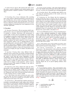 SIGNIFICANCE AND USE 5.1 This test method is intended to measure the resistance of solid surfaces to permanent deformation under the action of a single point (stylus tip). It is a companion method to quasi-static hardness tests in which a stylus is pressed into a surface under a certain normal load and the resultant depth or impression size is used to compute a hardness number. Scratch hardness numbers, unlike quasi-static hardness numbers, involve a different combination of properties of the surface because the indenter, in this case a diamond stylus, moves tangentially along the surface. Therefore, the stress state under the scratching stylus differs from that produced under a quasi-static indenter. Scratch hardness numbers are in principle a more appropriate measure of the damage resistance of a material to surface damage processes like two-body abrasion than are quasi-static hardness numbers. 5.2 This test method is applicable to a wide range of materials. These include metals, alloys, and some polymers. The main criteria are that the scratching process produces a measurable scratch in the surface being tested without causing catastrophic fracture, spallation, or extensive delamination of surface material. Severe damage to the test surface, such that the scratch width is not clearly identifiable or that the edges of the scratch are chipped or distorted, invalidates the use of this test method to determine a scratch hardness number. Since the degree and type of surface damage in a material may vary with applied load, the applicability of this test to certain classes of materials may be limited by the maximum load at which valid scratch width measurements can be made. 5.3 The resistance of a material to abrasion by a single point may be affected by its sensitivity to the strain rate of the deformation process. Therefore, this test is conducted under low stylus traversing speeds. Use of a slow scratching speed also minimizes the possible effects of frictional heating. 5.4 This... SCOPE 1.1 This test method covers laboratory procedures for determining the scratch hardness of the surfaces of solid materials. Within certain limitations, as described in this guide, this test method is applicable to metals, ceramics, polymers, and coated surfaces. The scratch hardness test, as described herein, is not intended to be used as a means to determine coating adhesion, nor is it intended for use with other than specific hemispherically-tipped, conical styli. 1.2 The values stated in SI units are to be regarded as standard. No other units of measurement are included in this standard. 1.3 This standard may involve hazardous materials, operations, and equipment. This standard does not purport to address all of the safety concerns, if any, associated with its use. It is the responsibility of the user of this standard to establish appropriate safety, health, and environmental practices and determine the applicability of regulatory limitations prior to use. 1.4 This international standard was developed in accordance with internationally recognized principles on standardization established in the Decision on Principles for the Development of International Standards, Guides and Recommendations issued by the World Trade Organization Technical Barriers to Trade (TBT) Committee.