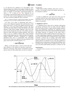 SIGNIFICANCE AND USE 4.1 Multiaxial forces often tend to introduce deformation and damage mechanisms that are unique and quite different from those induced under a simple uniaxial loading condition. Since most engineering components are subjected to cyclic multiaxial forces it is necessary to characterize the deformation and fatigue behaviors of materials in this mode. Such a characterization enables reliable prediction of the fatigue lives of many engineering components. Axial-torsional loading is one of several possible types of multiaxial force systems and is essentially a biaxial type of loading. Thin-walled tubular specimens subjected to axial-torsional loading can be used to explore behavior of materials in two of the four quadrants in principal stress or strain spaces. Axial-torsional loading is more convenient than in-plane biaxial loading because the stress state in the thin-walled tubular specimens is constant over the entire test section and is well-known. This practice is useful for generating fatigue life and cyclic deformation data on homogeneous materials under axial, torsional, and combined in- and out-of-phase axial-torsional loading conditions. SCOPE 1.1 The standard deals with strain-controlled, axial, torsional, and combined in- and out-of-phase axial torsional fatigue testing with thin-walled, circular cross-section, tubular specimens at isothermal, ambient and elevated temperatures. This standard is limited to symmetric, completely-reversed strains (zero mean strains) and axial and torsional waveforms with the same frequency in combined axial-torsional fatigue testing. This standard is also limited to characterization of homogeneous materials with thin-walled tubular specimens and does not cover testing of either large-scale components or structural elements. 1.2 This standard does not purport to address all of the safety concerns, if any, associated with its use. It is the responsibility of the user of this standard to establish appropriate safety, health, and environmental practices and determine the applicability of regulatory limitations prior to use. 1.3 This international standard was developed in accordance with internationally recognized principles on standardization established in the Decision on Principles for the Development of International Standards, Guides and Recommendations issued by the World Trade Organization Technical Barriers to Trade (TBT) Committee.