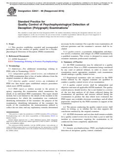 ASTM E2031-99(2016) is a standard published by ASTM International. Its full title is "Standard Practice for Quality Control of Psychophysiological Detection of Deception (Polygraph) Examinations". This standard covers: ABSTRACT This practice establishes essential and recommended procedures for the conduct of quality control for a Psychophysiological Detection of Deception (PDD) examination, or polygraph examinations. The procedures state that all PDD examinations may be subjected to a quality control review. Experienced examiners who are trained in the PDD format utilized by the original examiner are qualified to conduct a quality control review of an examination. A quality control review shall be independent and objective and meet all applicable ASTM standards. The quality control process should involve the review of test data analysis of all charts collected, questions and answers utilized, the PDD report, among others. The person conducting the quality control review shall attest, in writing, as to whether the test data supports the conclusion rendered by the original examiner. All PDD documents and test data shall remain available for a quality control review for no less than a year or until the incident or circumstance requiring the examination to be conducted has been completely adjudicated. SCOPE 1.1 This practice establishes essential and recommended procedures for the conduct of quality control for a Psychophysiological Detection of Deception (PDD) examination.