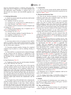 ABSTRACT This specification covers bare rope-lay-stranded conductors having concentric-stranded members made from round copper wires, either uncoated or coated with tin, lead, or lead-alloy for use as electrical conductors. Coated wires shall include only those wires with finished diameters and densities substantially equal to the respective diameters and densities of uncoated wires. The rope-lay-stranded copper conductors under this specification are classified either as Class G or Class H. Requirements for joint construction (by soldering, brazing, or welding), lay length, and strand construction are detailed. Tests for the electrical properties of wires composing conductors made from soft or annealed copper wire, bare or coated, shall be made before stranding, while tests for the physical properties (such as elongation) may be made upon the wires before stranding or upon wires removed from the completed stranded conductors, but need not be made upon both. Elongation tests to determine compliance shall not be made on the conductor as a unit. If a tinning, lead-coating, or lead-alloy-coating test is required, it shall be made on the wires prior to stranding. The method of calculating mass, cross-sections and electrical resistance, and the prescribed density of copper to be taken for calculations are given. SCOPE 1.1 This specification covers bare rope-lay-stranded conductors having concentric-stranded members made from round copper wires, either uncoated or coated with tin, lead, or lead-alloy for use as electrical conductors (Explanatory Note 1 and Note 2). 1.2 Coated wires shall include only those wires with finished diameters and densities substantially equal to the respective diameters and densities of uncoated wires. 1.3 The values stated in inch-pound or SI units are to be regarded separately as standard. Each system shall be used independently of the other. Combining values from the two systems may result in nonconformance with the specification. For conductor sizes designated by AWG or kcmil, the requirements in SI units have been numerically converted from corresponding values, stated or derived, in inch-pound units. For conductor sizes designated by SI units only, the requirements are stated or derived in SI units. 1.3.1 For density, resistivity, and temperature, the values stated in SI units are to be regarded as standard. 1.4 This international standard was developed in accordance with internationally recognized principles on standardization established in the Decision on Principles for the Development of International Standards, Guides and Recommendations issued by the World Trade Organization Technical Barriers to Trade (TBT) Committee.