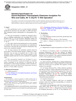 ASTM D4245-21 is a technical specification published by ASTM International. Its full title is "Standard Specification for Ozone-Resistant Thermoplastic Elastomer Insulation For Wire and Cable, 90 °C Dry/75 °C Wet Operation". This standard covers: ABSTRACT This specification covers ozone-resistant thermoplastic elastomer insulation for electrical wires and cables operating continuously at specified conductor temperatures, within the specified voltage range, and under wet or dry conditions. The prescribed tests cannot be performed unless the insulation is formed around a conductor, but these are done solely to determine the insulation properties and not to test the conductor or completed cable. Each test sample should be subjected to ac and dc voltage withstand tests as well as insulation resistance tests and should comply with the required values for aging, heat distortion, electrical permittivity, increase in capacitance, stability factor, and accelerated water absorption. SCOPE 1.1 This specification covers an ozone-resistant insulating compound for electrical wire and cables 14 AWG and larger. This compound consists substantially of a thermoplastic elastomer. 1.2 This type of insulation is suitable for continuous operation at conductor temperatures not exceeding 90 °C in dry locations and 75 °C in wet locations. Operating voltages are not to exceed 2000 V. The minimum installation temperature is −40 °C. 1.3 The values stated in inch-pound units are to be regarded as standard. The values given in parentheses are mathematical conversions to SI units that are provided for information only and are not considered standard. 1.4 In many instances the insulation material cannot be tested unless it has been formed around a conductor or cable. Therefore, tests are done on insulated wire or cable in this document solely to determine the relevant property of the insulation material and not to test the conductor or completed cable. 1.5 This international standard was developed in accordance with internationally recognized principles on standardization established in the Decision on Principles for the Development of International Standards, Guides and Recommendations issued by the World Trade Organization Technical Barriers to Trade (TBT) Committee.