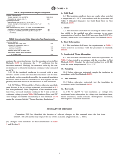 ABSTRACT This specification covers ozone-resistant thermoplastic elastomer insulation for electrical wires and cables operating continuously at specified conductor temperatures, within the specified voltage range, and under wet or dry conditions. The prescribed tests cannot be performed unless the insulation is formed around a conductor, but these are done solely to determine the insulation properties and not to test the conductor or completed cable. Each test sample should be subjected to ac and dc voltage withstand tests as well as insulation resistance tests and should comply with the required values for aging, heat distortion, electrical permittivity, increase in capacitance, stability factor, and accelerated water absorption. SCOPE 1.1 This specification covers an ozone-resistant insulating compound for electrical wire and cables 14 AWG and larger. This compound consists substantially of a thermoplastic elastomer. 1.2 This type of insulation is suitable for continuous operation at conductor temperatures not exceeding 90 °C in dry locations and 75 °C in wet locations. Operating voltages are not to exceed 2000 V. The minimum installation temperature is −40 °C. 1.3 The values stated in inch-pound units are to be regarded as standard. The values given in parentheses are mathematical conversions to SI units that are provided for information only and are not considered standard. 1.4 In many instances the insulation material cannot be tested unless it has been formed around a conductor or cable. Therefore, tests are done on insulated wire or cable in this document solely to determine the relevant property of the insulation material and not to test the conductor or completed cable. 1.5 This international standard was developed in accordance with internationally recognized principles on standardization established in the Decision on Principles for the Development of International Standards, Guides and Recommendations issued by the World Trade Organization Technical Barriers to Trade (TBT) Committee.