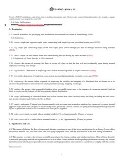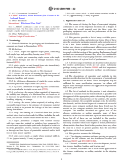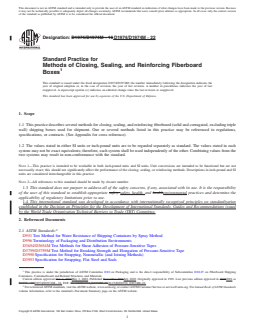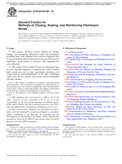SIGNIFICANCE AND USE 4.1 The means of closing the flaps of corrugated shipping containers is one of the important decisions for a shipper. It may affect the overall material cost, the labor costs, the packaging equipment costs, and the performance of the box during distribution. 4.2 This practice provides a list of many available procedures for closing, sealing, and reinforcing boxes. Most of these describe a particular packaging material and a particular use of it on a box. Some methods involve package performance testing; any closure or reinforcement which passes prescribed tests (usually on the proposed box and contents) is considered to comply with that section of this practice. Performance-based methods are encouraged because they allow for considerable flexibility in the choice of packaging materials and methods yet provide assurance of a given level of performance. 4.3 A diverse range of methods are described in this practice but relative performance levels are not given. Laboratory package testing such as Practice D4169 and field experience are recommended to rate alternative methods on performance for the intended use. 4.4 The descriptions of materials and methods in this practice provide direction for the procurement of materials and for their common uses on boxes. These descriptions may be sufficient for some specification purposes, but others will require more thorough material and application requirements than those given here. 4.5 The list of methods in this practice is not exhaustive; deviation or variation from the listed methods is possible with the approval of the appropriate parties referencing this practice. Depending on the characteristics of the contents, the specific shipping container, the acceptable package costs, the distribution hazards, and the desired degree of assurance of successful shipment, more stringent methods than those listed may be needed or less stringent methods than those listed may be adequate. The methods described are typical uses... SCOPE 1.1 This practice describes several methods for closing, sealing, and reinforcing fiberboard (solid and corrugated, excluding triple wall) shipping boxes used for shipment. One or several methods listed in this practice may be referenced in regulations, specifications, or contracts. (See Appendix for cross reference). 1.2 The values stated in either SI units or inch-pound units are to be regarded separately as standard. The values stated in each system may not be exact equivalents; therefore, each system shall be used independently of the other. Combining values from the two systems may result in non-conformance with the standard. Note 1: This practice is intended to be workable in both inch-pound units and SI units. Unit conversions are intended to be functional but are not necessarily exact; this should not significantly affect the performance of the closing, sealing, or reinforcing methods. Descriptions in inch-pound and SI units are considered interchangeable in this practice. Note 2: All references to this standard should be made by closure number. 1.3 This standard does not purport to address all of the safety concerns, if any, associated with its use. It is the responsibility of the user of this standard to establish appropriate safety, health, and environmental practices and determine the applicability of regulatory limitations prior to use. 1.4 This international standard was developed in accordance with internationally recognized principles on standardization established in the Decision on Principles for the Development of International Standards, Guides and Recommendations issued by the World Trade Organization Technical Barriers to Trade (TBT) Committee.