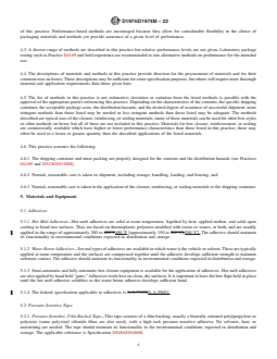 - Range of Closure Methods: The standard lists multiple techniques for box closure, including adhesives, various types of tape (pressure-sensitive, film-backed, reinforced gummed), staples, stitches, and box strapping. Each method is described with reference to suitable packaging material and typical application areas.