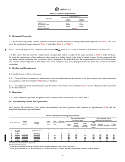 ABSTRACT This specification covers the requirements for quenched and tempered alloy steel socket-head cap screws. The screws shall be fabricated from steel made to fine grain practice and shall be alloy steel conforming to the chemical composition specified. Different tests shall be conducted in order to determine the following mechanical properties of screws: tensile or wedge strength, proof load, yield strength, elongation, Rockwell hardness, and Vickers hardness. SCOPE 1.1 This specification covers the requirements for quenched and tempered alloy steel hexagon socket-head cap screws, 0.060 through 4 in. in diameter where high strength is required. 1.2 The values stated in inch-pound units are to be regarded as standard. No other units of measurement are included in this standard. 1.3 The following hazard caveat pertains only to the test method portions, Sections 5.1, 5.6, 8, and 12, of this specification. This standard does not purport to address all of the safety concerns, if any, associated with its use. It is the responsibility of the user of this standard to establish appropriate safety, health, and environmental practices and determine the applicability of regulatory limitations prior to use. 1.4 This international standard was developed in accordance with internationally recognized principles on standardization established in the Decision on Principles for the Development of International Standards, Guides and Recommendations issued by the World Trade Organization Technical Barriers to Trade (TBT) Committee.