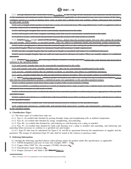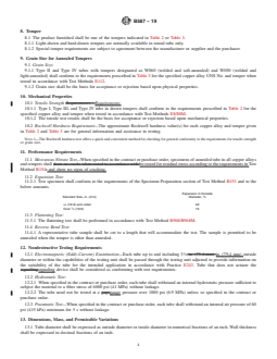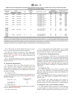- Requirements for tensile strength, Rockwell hardness, and grain size are detailed based on tube type, alloy, and temper.