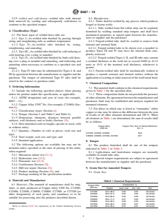 This specification establishes the requirements for round, rectangular, and square copper alloy welded tube for general engineering applications. The tubes are classified into four types: Type I tubes which are finished by passing through sizing and straightening rolls at ambient temperature; Type II tubes which are finished by sizing, straightening, and annealing; Type III tubes which are finished by cold reducing or cold drawing over a plug or mandrel; and Type IV tubes which are finished by cold drawing over a plug or mandrel and annealing, and redrawing and annealing when necessary to conform to a specified size and temper. Tubes shall be welded by any process which produces forged or fusion welds. Forged-welded tube shall be scarfed to remove both internal and external flash. Forged-welded tube to be drawn over a mandrel to produce Types III and IV may have the internal flash completely removed. Fusion-welded tube shall be mechanically worked to produce a smooth external and internal surface without the application of scarfing or other removal of the weld metal bead. Grain size and mechanical properties such as tensile strength and Rockwell hardness shall be determined. The tubes shall be subjected to mercury nitrate, expansion, flattening, and reverse bend tests for performance evaluation. Non-destructive tests such as eddy-current test, hydrostatic test, and pneumatic tests shall be done as well.