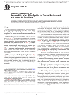 ASTM E2320-19 is a standard published by ASTM International. Its full title is "Standard Classification for Serviceability of an Office Facility for Thermal Environment and Indoor Air Conditions". This standard covers: SIGNIFICANCE AND USE 4.1 Each Occupant Requirement Scale (see Figs. 1-5) in this classification provides a means to set the required level of serviceability of a building or facility for one topic of serviceability and to compare that level against any level of any other occupant, or of any building or facility. 4.2 Each Facility Rating Scale (see Figs. 1-5) in this classification provides a means to estimate the level of serviceability of a building or facility for one topic of serviceability and to compare that level against any level of requirement of any occupant, or of any other building or facility. 4.3 This classification can be used for comparing how well different buildings or facilities meet a particular requirement for serviceability. It is applicable despite differences such as location, structure, mechanical systems, age, and building shape. 4.4 This classification can be used to estimate the amount of variance of serviceability from target or from requirement, for a single office facility, or within a group of office facilities. 4.5 This classification can be used to estimate the following: 4.5.1 Serviceability of an existing facility for uses other than its present use. 4.5.2 Serviceability (potential) of a facility that has been planned but not yet built. 4.5.3 Serviceability (potential) of a facility for which remodeling has been planned. 4.6 Use of this classification does not result in building evaluation or diagnosis. Building evaluation or diagnosis generally requires a special expertise in building engineering or technology, and the use of instruments, tools, or measurements. 4.7 This classification applies only to facilities that are building constructions, or part thereof. (While classification may be useful in rating the serviceability of facilities that are not building constructions, such facilities are outside the scope of this classification. See discussion under definition 3.1.1.) 4.8 This classification is not intended for, an... SCOPE 1.1 This classification contains pairs of scales for classifying an aspect of the serviceability of an office facility, that is, the capability of an office facility to meet certain possible requirements for suitable thermal environment and indoor air conditions. 1.2 Within this aspect of serviceability, each pair of scales shown in Figs. 1-53 is for classifying one topic of serviceability. Each topic typically is broken down into two more demand functions and supply features. Each paragraph in an Occupant Requirement Scale (DEMAND Scale, see Figs. 1-5) summarizes one level of requirement for serviceability on that function, which occupants might require. The matching paragraph in the Facility Rating Scale (SUPPLY Scale, see Figs. 1-5) is a translation of the requirement into a description of certain features of a facility which, taken in combination, indicate that the facility is likely to meet that level of required serviceability. FIG. 1 Demand Scale A.4.1 for Information on Temperature and Humidity FIG. 1 Demand Scale A.4.1 for Information on Temperature and Humidity (continued) FIG. 1 Demand Scale A.4.1 for Information on Temperature and Humidity (continued) FIG. 1 Supply Scale A.4.1 for Information on Temperature and Humidity (continued) FIG. 1 Supply Scale A.4.1 for Information on Temperature and Humidity (continued) FIG. 1 Supply Scale A.4.1 for Information on Temperature and Humidity (continued) FIG. 2 Demand Scale A.4.2 for Information on Indoor Air Quality Conditions FIG. 2 Demand Scale A.4.2 for Information on Indoor Air Quality Conditions (continued) FIG. 2 Supply Scale A.4.2 for Information on Indoor Air Quality (continued) FIG. 2 Supply Scale A.4.2 for Information on Indoor Air Quality (continued) FIG. 2 Supply Scale A.4.2 for Information on Indoor Air Quality (continued) FIG. 3 Demand Scale A.4.3 for Information on Ventilation Supply Air FIG. 3 Demand Scale A.4.3 ...