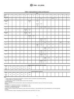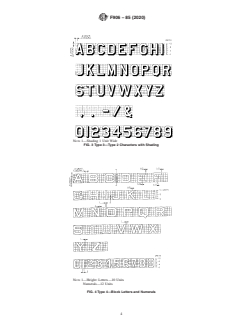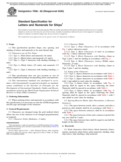 ABSTRACT This specification covers the shape, size, spacing, and shading requirements of letters and numerals used in shipboard markings. Covered by this specification are five types of characters: plain letters and numerals (Type 1), block letters and numerals having the same width (Type 2), Type 2 characters with shading (Type 3), block letters and numerals of different widths (Type 4), and Type 4 characters with shading (Type 5). The characters shall be designed using the grid method, which will allow one to change the character size proportionately as required. Not covered in this specification are the location and size of various shipboard markings using letters and numerals. SCOPE 1.1 This specification specifies shape, size, spacing, and shading of letters and numerals to be used aboard ship. 1.2 Characters are of Five Types: 1.2.1 Type 1—Plain letters and numerals (16 units). 1.2.2 Type 2—Block letters and numerals (12 units). 1.2.3 Type 3—Type 2 characters with shading (shading—1 unit). 1.2.4 Type 4—Block letters (10 units) and numerals (12 units). 1.2.5 Type 5—Type 4 characters with shading (shading—1 unit). 1.3 This specification does not give location or size of various shipboard markings incorporating letters and numerals. 1.4 This international standard was developed in accordance with internationally recognized principles on standardization established in the Decision on Principles for the Development of International Standards, Guides and Recommendations issued by the World Trade Organization Technical Barriers to Trade (TBT) Committee.