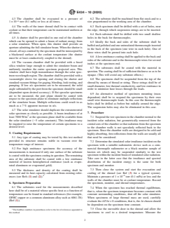ABSTRACT This test method covers measurement techniques for calorimetrically determining the ratio of solar absorptance to hemispherical emittance using a steady-state method, and for calorimetrically determining the total hemispherical emittance using a transient technique. The main elements of the apparatus include a vacuum system, a cold shroud within the vacuum chamber, instrumentation for temperature measurement, and a solar simulator. Any type of coating may be tested by this test method provided its structure remains stable in vacuum over the temperature range of interest. The substrate shall be machined from flat stock and to a size proportioned to the working area of the chamber. SCOPE 1.1 This test method covers measurement techniques for calorimetrically determining the ratio of solar absorptance to hemispherical emittance using a steady-state method, and for calorimetrically determining the total hemispherical emittance using a transient technique. 1.2 This standard does not purport to address all of the safety concerns, if any, associated with its use. It is the responsibility of the user of this standard to establish appropriate safety, health, and environmental practices and determine the applicability of regulatory limitations prior to use. 1.3 This international standard was developed in accordance with internationally recognized principles on standardization established in the Decision on Principles for the Development of International Standards, Guides and Recommendations issued by the World Trade Organization Technical Barriers to Trade (TBT) Committee.