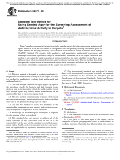 ASTM E2471-23 is a standard published by ASTM International. Its full title is "Standard Test Method for Using Seeded-Agar for the Screening Assessment of Antimicrobial Activity In Carpets". This standard covers: SIGNIFICANCE AND USE 5.1 This test method provides for rapid screening of antimicrobial treatments located in or on the carpet face fiber or incorporated into the backing structure of the carpet (or both). 5.2 This test method simulates actual use conditions that may occur on carpets (for example, food and beverage spills, soiling from foot traffic, prolonged moisture exposure). 5.3 This test method provides a means to screen for activity and durability of an antimicrobial treatment under conditions of organic loading. 5.4 This test method provides for the simultaneous assessment of multiple carpet components for antimicrobial activity. 5.5 Carpets may be cleaned prior to testing with this test method in order to assess the durability of the antimicrobial effect. SCOPE 1.1 This test method is designed to evaluate (qualitatively) the presence of antimicrobial activity in or on carpets. Use this test method to qualitatively evaluate both antibacterial and antifungal activity. 1.2 Use half strength (nutrient and agar) tryptic soy agar as the inoculum vehicle for bacteria and half strength potato dextrose agar as the inoculum vehicle for mold conidia. Use of half strength agars may reduce undue neutralization of an antimicrobial due to excessive organic load. 1.3 This test method simultaneously evaluates (both visual and stereo-microscopic) antimicrobial activity both at the fiber layer and at the primary backing layer of carpet. 1.4 Use this test method to assess the durability of the antimicrobial treatments on new carpets, and on those repeatedly shampooed or exposed to in-use conditions. 1.5 Knowledge of microbiological techniques is required for the practice of this test method. 1.6 This standard does not purport to address all of the safety concerns, if any, associated with its use. It is the responsibility of the user of this standard to establish appropriate safety, health, and environmental practices and determine the applicability of regulatory limitations prior to use. 1.7 This international standard was developed in accordance with internationally recognized principles on standardization established in the Decision on Principles for the Development of International Standards, Guides and Recommendations issued by the World Trade Organization Technical Barriers to Trade (TBT) Committee.