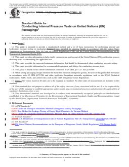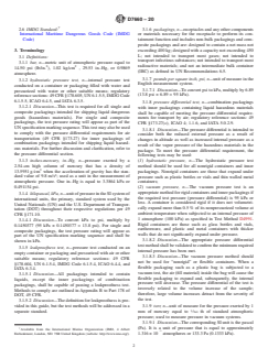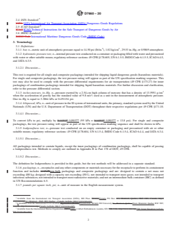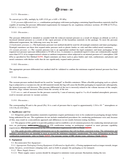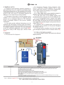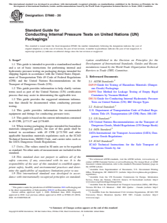 SIGNIFICANCE AND USE 4.1 Dangerous goods (hazardous materials) regulations require performance tests to be conducted on packaging designs before being authorized for use. The regulations do not include standardized procedures for conducting performance tests and, because of this, may result in a non-uniform approach and differences in test results between testing facilities. 4.2 The purpose of this guide is to provide guidance and to establish a set of common practices for conducting internal pressure tests on packagings subjected to UN certification testing or packagings required to meet pressure capability requirements. 4.3 This guide provides additional information not in the regulations that will facilitate consistent testing. The information and guidance provided here are intended to meet or exceed the minimum regulatory requirements. For more information on the UN certification requirements, refer to Guide D4919. For pressure testing of IBC design types, reference Guide D8134. SCOPE 1.1 This guide is intended to provide a standardized method and a set of basic instructions for performing internal and hydrostatic pressure testing on packaging designs intended for shipping liquids in accordance with the United States Department of Transportation Title 49 Code of Federal Regulations (CFR) and the United Nations Recommendations on the Transport of Dangerous Goods (UN). 1.2 This guide provides information to help clarify various terms used as part of the United Nations (UN) certification process that may assist in determining the applicable test. 1.3 This guide provides the suggested minimum information that should be documented when conducting pressure testing. 1.4 This guide provides information for recommended equipment and fittings for conducting pressure tests. 1.5 This guide is based on the current information contained in 49 CFR, §173.27 and §178.605. 1.6 When testing packaging designs intended for hazardous materials (dangerous goods), the user of this guide shall be trained in accordance with 49 CFR §172.700 and other applicable hazardous materials regulations such as the ICAO Technical Instructions, IMDG Code, and carrier rules such as the IATA Dangerous Goods Regulations. 1.7 Units—The values stated in SI units are to be regarded as standard. No other units of measurement are included in this standard. 1.8 This standard does not purport to address all of the safety concerns, if any, associated with its use. It is the responsibility of the user of this standard to establish appropriate safety, health, and environmental practices and determine the applicability of regulatory limitations prior to use. 1.9 This international standard was developed in accordance with internationally recognized principles on standardization established in the Decision on Principles for the Development of International Standards, Guides and Recommendations issued by the World Trade Organization Technical Barriers to Trade (TBT) Committee.