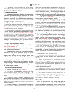 ABSTRACT This specification applies to technically important, commercially available, magnetically hard sintered (fully dense) permanent magnets commonly known as samarium cobalt (SmCo). SmCo permanent magnets are available in two general composition families abbreviated “SmCo 1:5” and “SmCo 2:17.” These materials have approximate magnetic properties of residual magnetic induction from 0.78 T (7800 G) to 1.18 T (11 800 G) and intrinsic coercivity typically greater than 800 kA/m (10 000 Oe). Special grades and isotropic (un-aligned) magnets can have properties outside these ranges. Specific magnetic hysteresis behavior (demagnetization curve) can be characterized using Test Method A977/A977M. SCOPE 1.1 This specification covers technically important, commercially available, magnetically hard sintered (fully dense) permanent magnets commonly known as samarium cobalt. These materials are available in two general composition families abbreviated “SmCo 1:5” and “SmCo 2:17.” The numbers indicate the approximate atomic ratio of samarium to the sum of other constituents. (Refer to Appendix X3 for additional composition information.) 1.2 Samarium cobalt magnets have approximate magnetic properties of residual magnetic induction, Br, from 0.78 T (7800 G) to 1.18 T (11 800 G) and intrinsic coercivity, HcJ, typically greater than 800 kA/m (10 000 Oe). Special grades and isotropic (un-aligned) magnets can have properties outside these ranges (see Appendix X4). Specific magnetic hysteresis behavior (demagnetization curve) can be characterized using Test Method A977/A977M. 1.3 The values stated in SI units are to be regarded as standard. The values given in parentheses are mathematical conversions to customary (cgs-emu and inch-pound) units which are provided for information only and are not considered standard. 1.4 This standard does not purport to address all of the safety concerns, if any, associated with its use. It is the responsibility of the user of this standard to establish appropriate safety, health, and environmental practices and determine the applicability of regulatory limitations prior to use. 1.5 This international standard was developed in accordance with internationally recognized principles on standardization established in the Decision on Principles for the Development of International Standards, Guides and Recommendations issued by the World Trade Organization Technical Barriers to Trade (TBT) Committee.