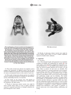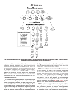 SIGNIFICANCE AND USE 5.1 An acute toxicity test is conducted to assess effects of a short-term exposure of organisms to a test material under specific experimental conditions. An acute toxicity test does not provide information concerning whether delayed effects will occur and typically evaluates effects on survival. A chronic test is typically longer in duration and includes a sublethal endpoint to assess effects on a population that might occur beyond the exposure period. Because the echinoderm embryo development test includes a sublethal endpoint, but is also short in duration, these tests are considered to be short-term chronic tests, consistent with EPA guidance. 5.2 Because embryos and larvae are usually assumed to be the most sensitive life stages of these echinoid species, and because some of these species are commercially and recreationally important, the results of these tests are often considered to be a good indication of the acceptability of pollutant concentrations to saltwater species in general. The results of these toxicity tests are often assumed to be an important consideration when assessing the hazard of materials to other saltwater organisms (see Guides E724 and E1023) or when deriving water quality criteria for saltwater organisms (7). 5.3 The results of short-term chronic toxicity tests might be used to predict effects likely to occur to aquatic organisms in field situations as a result of exposure under comparable conditions, except that toxicity to benthic species might depend on sorption or settling of the test material onto the substrate. 5.4 The results of short-term chronic tests might be used to compare the sensitivities of different species and the acute toxicities of different test materials, and to determine the effects of various environmental factors on the results of such tests. 5.5 The results of short-term chronic toxicity tests might be useful for studying the biological availability of, and structure-activity relationships between, t... SCOPE 1.1 This guide covers procedures for obtaining laboratory data concerning the short-term chronic effects of a test material on echinoderm embryos and the resulting larvae (sea urchins and sand dollars) during static 48- to 96-h exposures. These procedures have generally been used with U.S. East Coast (Arbacia punctulata and Strongylocentrotus droebachiensis ) (1)3 and West Coast species (Strongylocentrotus purpuratus, S. droebachiensis, and Dendraster excentricus) (2). The basic procedures described in this guide first originated in Japan and Scandanavia (3), and parallel procedures have been used with foreign species, especially in Japan and the Mediterranean (4). These procedures will probably be useful for conducting static toxicity tests with embryos of other echinoid species, although modifications might be necessary. 1.2 Other modifications of these procedures might be justified by special needs or circumstances. Although using procedures appropriate to a particular species or special needs and circumstances is more important than following prescribed procedures, the results of tests conducted by using unusual procedures are not likely to be comparable with those of many other tests. The comparison of results obtained by using modified and unmodified versions of these procedures might provide useful information concerning new concepts and procedures for conducting tests starting with embryos of echinoids. 1.3 These procedures are applicable to most chemicals, either individually or in formulations, commercial products, or known mixtures. With appropriate modifications, these procedures can be used to conduct tests on temperature, dissolved oxygen, and pH and on such materials as aqueous effluents (see also Guide E1192), leachates, oils, particulate matter, surface waters, effluents, and sediments (Annex A1). Renewal tests might be preferable to static tests for materials that have a high oxygen demand, are...