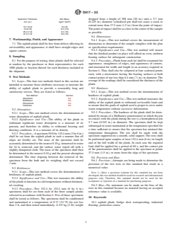 ASTM D517-23 is a technical specification published by ASTM International. Its full title is "Standard Specification for Asphalt Plank". This standard covers: ABSTRACT This specification covers asphalt plank used for bridge decks as well as for industrial floors. Asphalt planks shall be classified according to usage: Type Ia; Type Ib; and Type II. Asphalt plank shall be formed from a mixture of asphalt, fibers, modifiers, or a combination thereof, and mineral filler in such a manner as to produce a uniformly dense mass. The following test methods shall be intended to measure those attributes necessary to measure the ability of asphalt plank to provide a reasonably long and satisfactory service: absorption; brittleness; dimensions; and hardness. SCOPE 1.1 This specification covers asphalt plank used for bridge decks as well as for industrial floors. 1.2 The values stated in SI units are to be regarded as the standard. The values given in parentheses are for information only. 1.3 This standard does not purport to address all of the safety concerns, if any, associated with its use. It is the responsibility of the user of this standard to establish appropriate safety, health, and environmental practices and determine the applicability of regulatory limitations prior to use. 1.4 This international standard was developed in accordance with internationally recognized principles on standardization established in the Decision on Principles for the Development of International Standards, Guides and Recommendations issued by the World Trade Organization Technical Barriers to Trade (TBT) Committee.